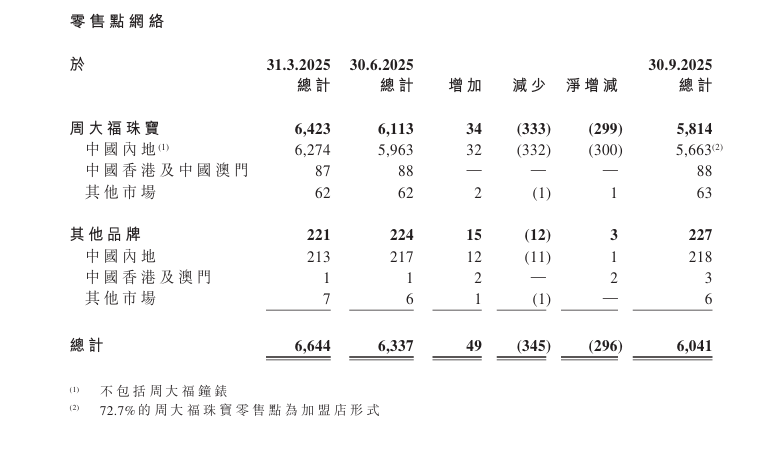 周大福零售门店数量变化。图源:周大福三季度主要经营数据