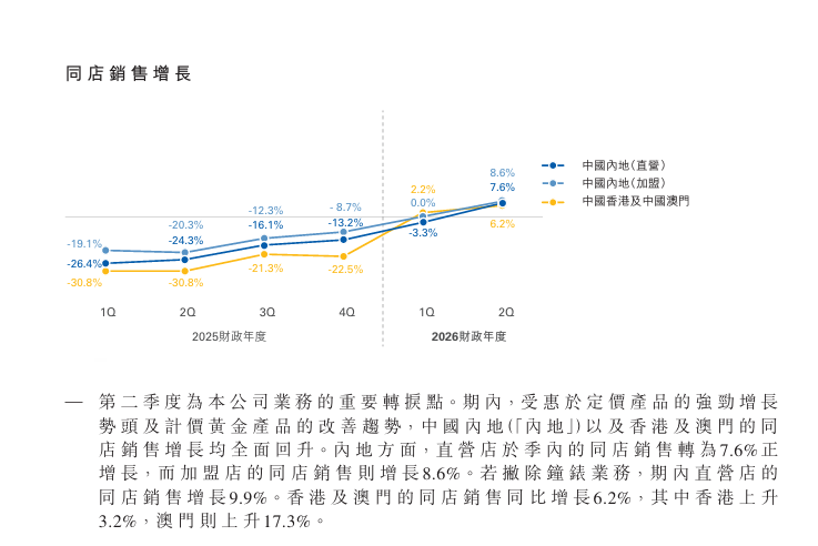 比如周大福的经营数据显示,内地方面,直营店于季内的同店销售转为7.6%正增长,而加盟店的同店销售则增长8.6%。周大生、六福集团也有类似情况出现。