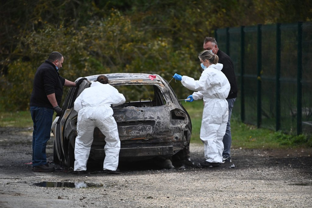 11月5日,在法国奥莱龙岛,法医在事故现场检查被烧毁的车辆。