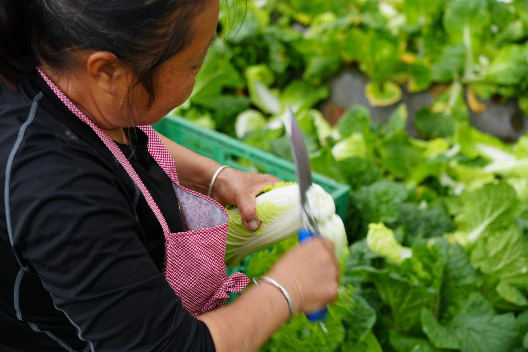 “重量可以微调,但其他标准是不变的。包裹紧实,无麻点黑点,无烂心烂叶。”为达到这一标准,采收工人手起刀落,利落地修去散乱外叶,只留下紧实菜心。