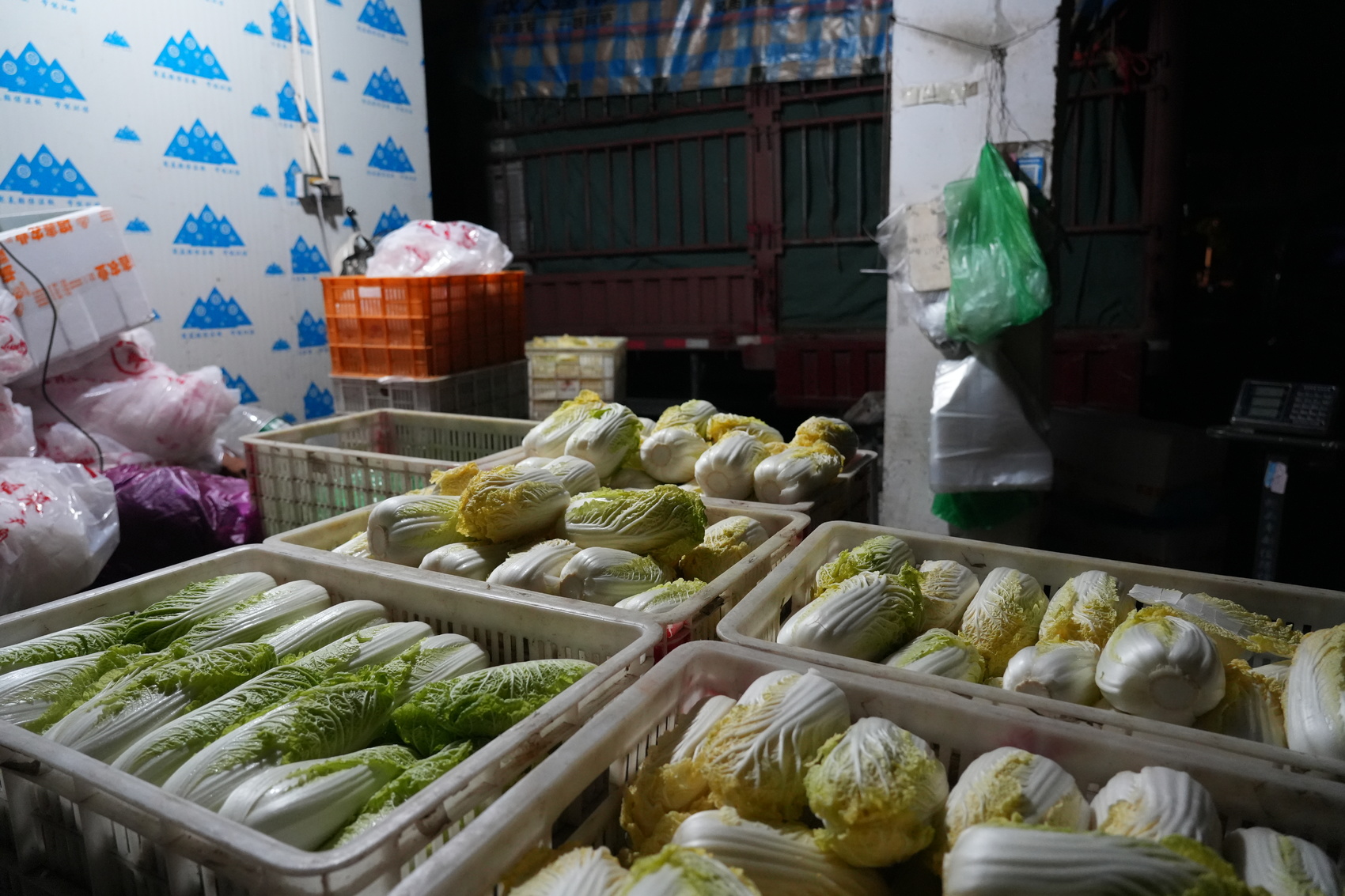 晚间8点,李勇载着40筐娃娃菜回到立达菜市。他随手从筐中取出一棵菜,叶片饱满,颜色鲜绿。“很多人就想吃这口‘鲜’!”他语气轻松地说道。