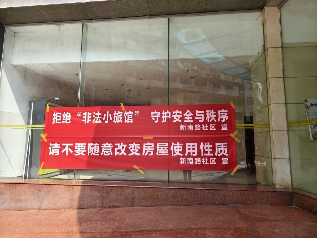 在这些小旅店老板带人进入的小区大门两侧,张贴有社区的大红宣传横幅:拒绝“非法小旅馆”、请不要随意改变房屋使用性质。吕先生告诉记者:“目前很多小旅馆老板是知法犯法,虽然已经严重影响了居民生活,但大家都拿他们没办法,物业只能让住客进行登记,社区也只能尽可能去宣传。”