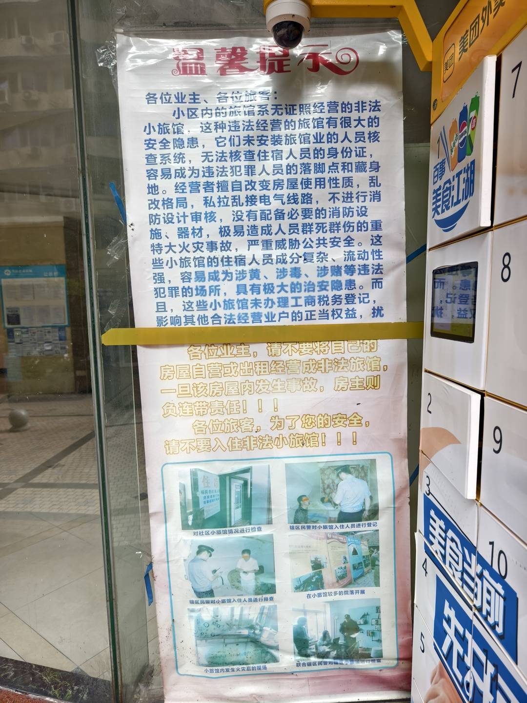 “你看,这也算是我们这一道独特‘风景’了,就是因为小旅店老板经常堵在这里拉客,才有了这个提示。”小区居民周女士说。
