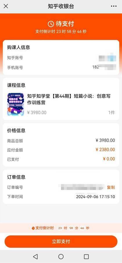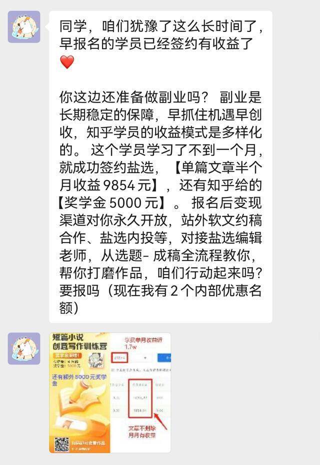 “几个月前,我在社交平台刷到一位写作培训博主,我爱好写作,所以加上微信进行了交流。此后,对方就一直缠着我,鼓动我报名一个叫‘创意写作训练营’的培训班。”秦女士称,对方发过来的宣传资料和宣传内容,多次强调“知乎”平台,基于对“知乎”平台的信任和对写作的热爱,她决定试一试。