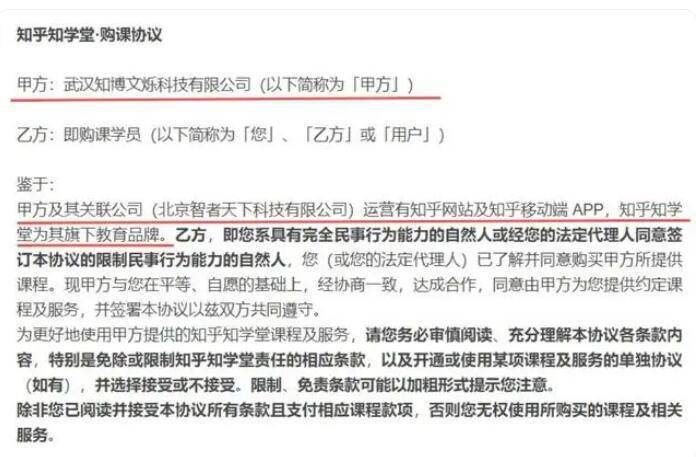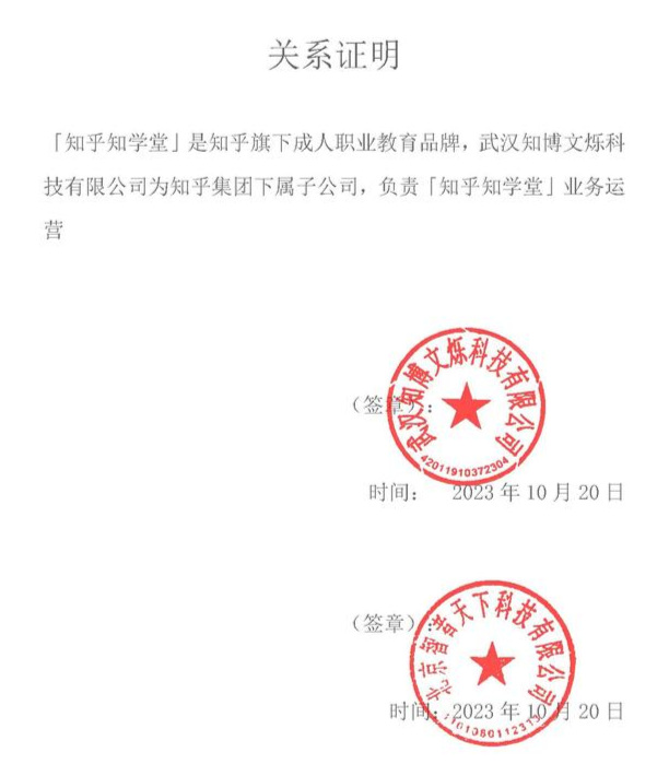 为了弄清楚情况,秦女士找到“知乎知学堂”客服核实。“我问知博文烁的客服,‘知乎知学堂’与‘知乎’到底是什么关系,对方发来一份盖了公章的证明,说是子公司与母公司的关系。奇怪的是,我们查询发现,知博文烁实际上是南京知著科技有限公司的子公司,跟‘知乎’的公司确实没有直接的关系。”
