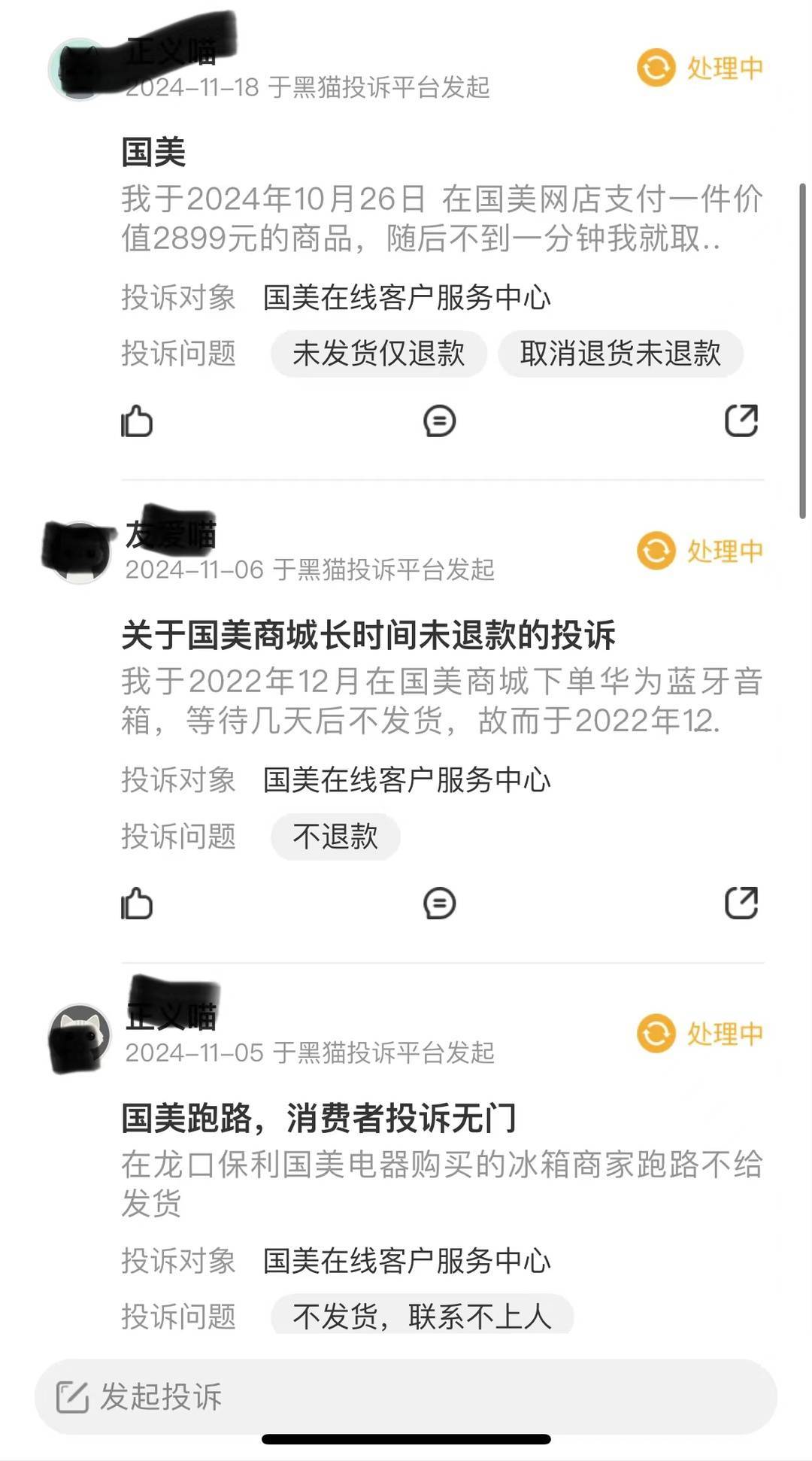 黑猫投诉对于国美电器投诉情况 网络截图