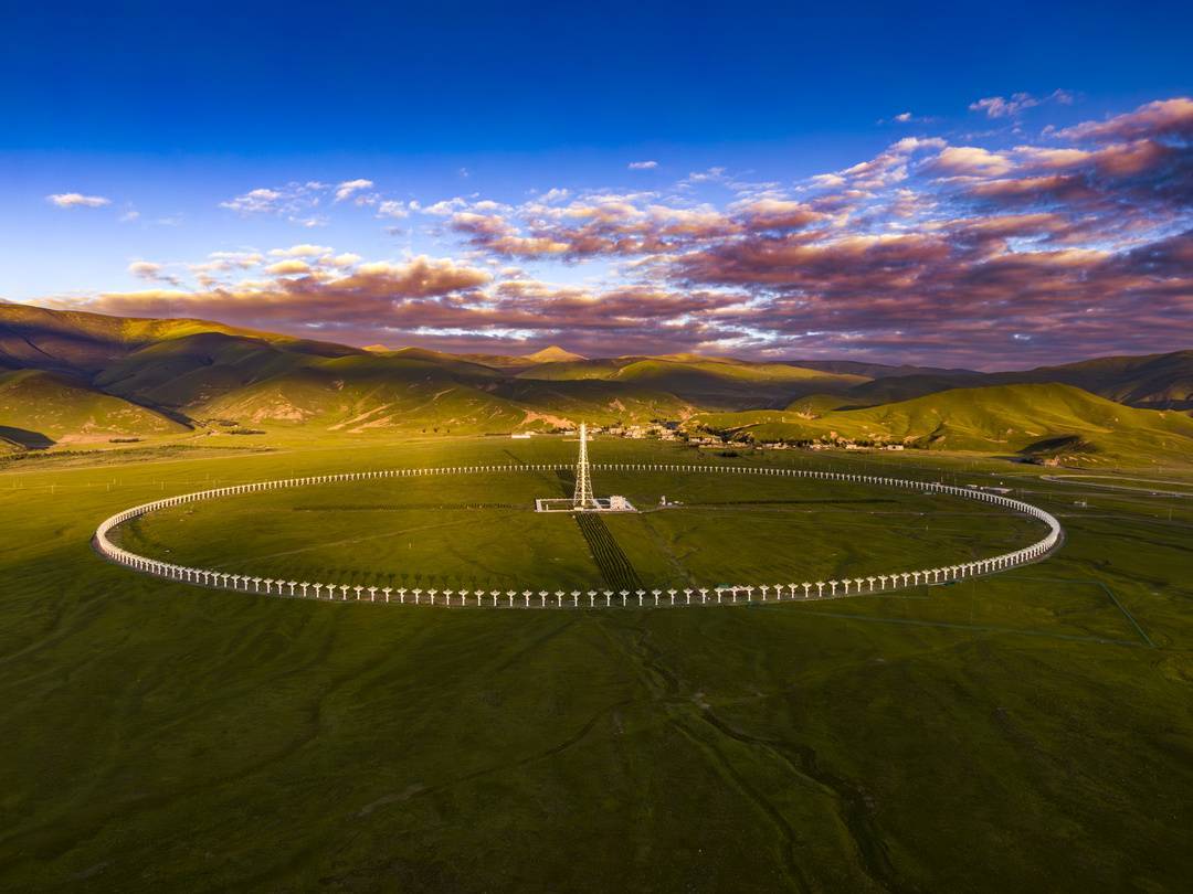 作为子午工程二期标志性设备,圆环阵太阳射电成像望远镜(“千眼天珠”),位于四川稻城县海拔3830米处。由313台直径6米的天线,均匀分布于1公里直径的圆环上,它们像一株株巨大的向日葵,跟着太阳转动,构成全球最大的综合孔径射电望远镜。