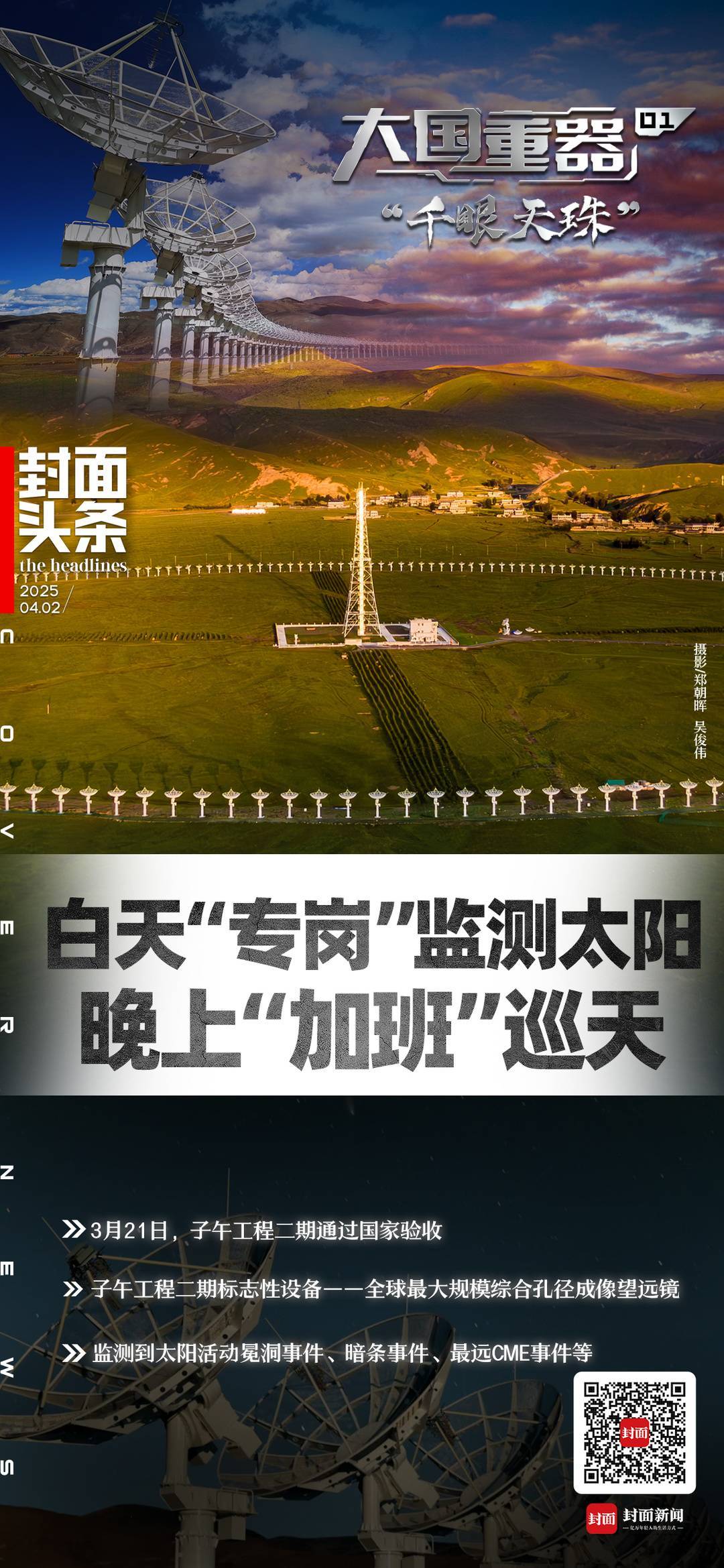 在这个天罗地网中,有一个布局在四川稻城的“大眼睛”。这组全球最大规模综合孔径成像望远镜,被形象地喻为“千眼天珠”。白天监测太阳活动,晚上“加班”巡天,堪称“子午大家庭”里的劳模。“‘千眼天珠’目前每天经处理后的数据大约2TB,在人工智能快速发展的浪潮中,我们也希望它变成智能体,具备自动化观测、自动化数据处理的能力。”空间中心研究员、子午工程二期圆环阵太阳射电成像望远镜数据处理和管理负责人邓丽告诉封面新闻记者。