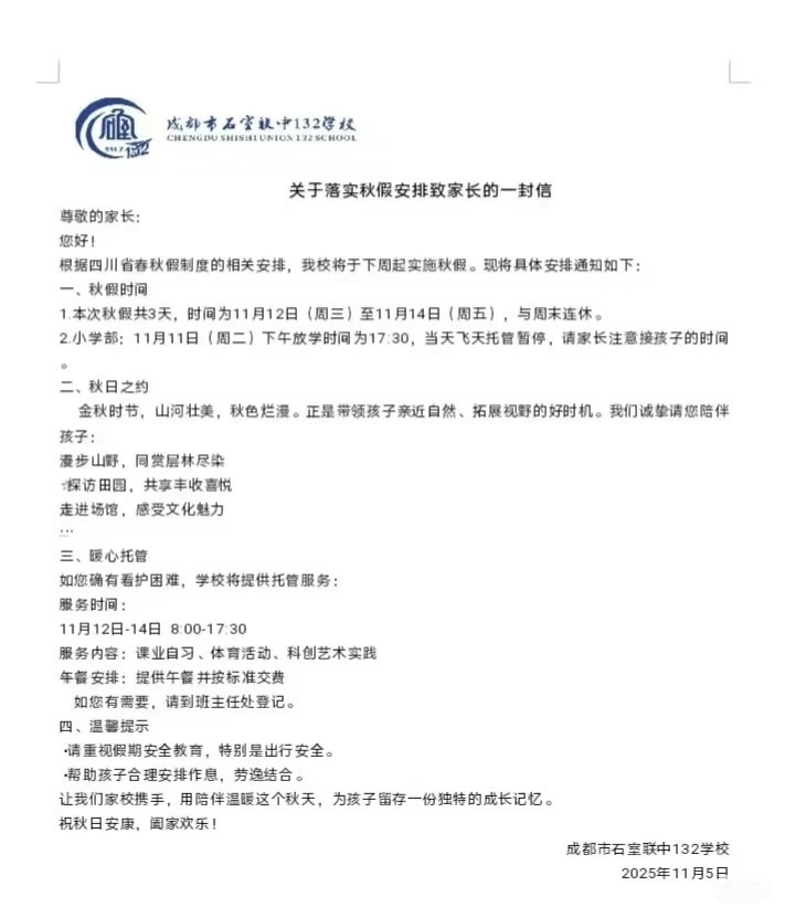 成都市实验小学、成都市金沙小学、成都市树德实验中学等学校的家长们也纷纷收到了学校发放的2025年秋假放假通知。在部分学校的放假通知里,假期安排一栏家长可自主勾选同意离校/申请留校。