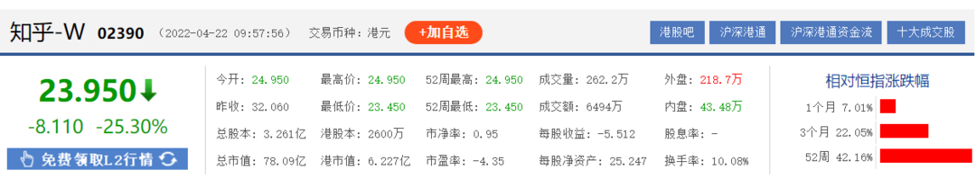 4月22日,知乎在港交所完成双重上市正式挂牌,股票代码“2390”,开盘价24.3港元,较32.06港元的发行价下跌24.2%。随后,知乎股价一路下行,开盘半小时之后,跌幅一度超过25%,市值约77.93亿港元。
