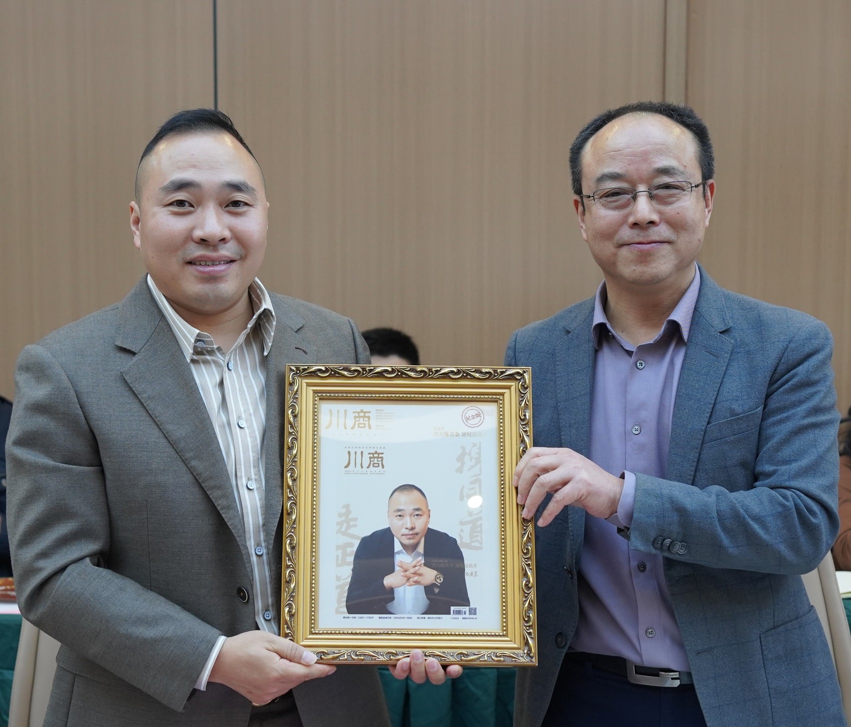 川报集团川商传媒总经理总编辑王仁刚向四川广创科技集团董事长张建军赠送《川商》杂志纪念版