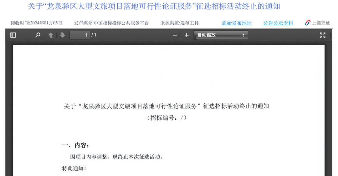 1月5日,据最新消息,招标方发布关于“龙泉驿区大型文旅项目落地可行性论证服务”征选招标活动终止的通知,因项目内容调整,现终止本次征选活动。