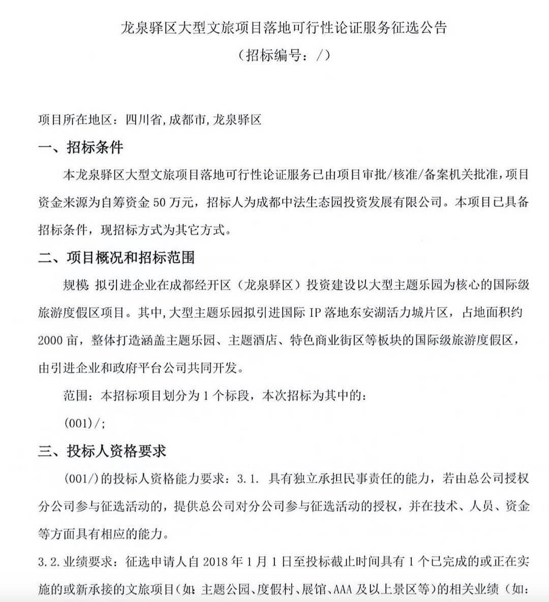 封面新闻记者在中国招标投标公共服务平台看到,龙泉驿区大型文旅项目落地可行性论证服务征选公告于1月2日发布。
