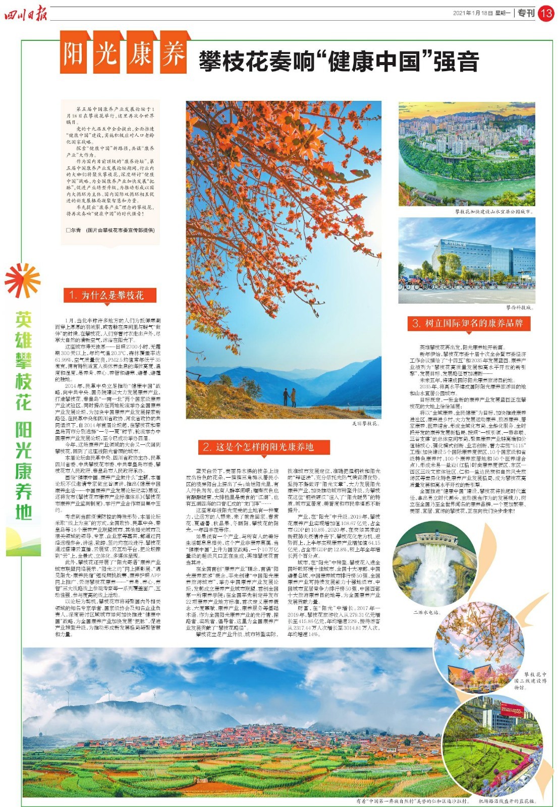 新年伊始,攀枝花市委十届十次全会暨市委经济工作会议描绘了“十四五”和2035年发展蓝图。康养产业被列为“攀枝花高质量发展和高水平开放的新引擎”,发展目标、发展路径更加清晰——