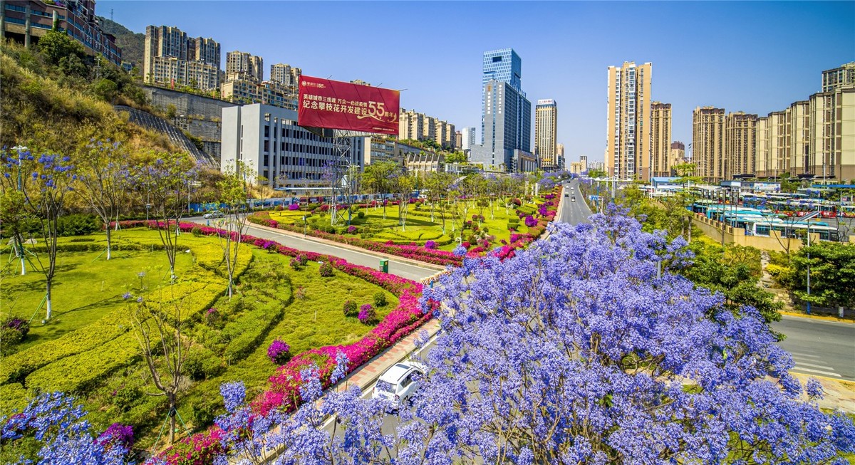 机场路沿线盛开的蓝花楹。