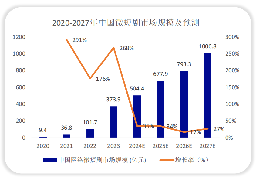 据艾媒咨询预测,2023年中国微短剧市场规模达373.9亿元,同比上升267.65%,预计2024年市场规模超500亿元,2027年超1000亿元。