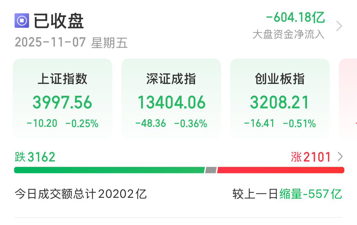 11月7日,A股三大指数集体小幅调整。截至收盘,上证指数跌0.25%,收报3997.56点;深成指跌0.36%,收报13404.06点;创业板指跌0.51%,收报3208.21点。沪深京三市全天成交额20202亿元,较上日缩量557亿元。全市场下跌个股3162只,上涨个股2101只,其中涨停的63只个股主要集中在化工、电力设备、环保、建筑装饰、交通运输等行业。