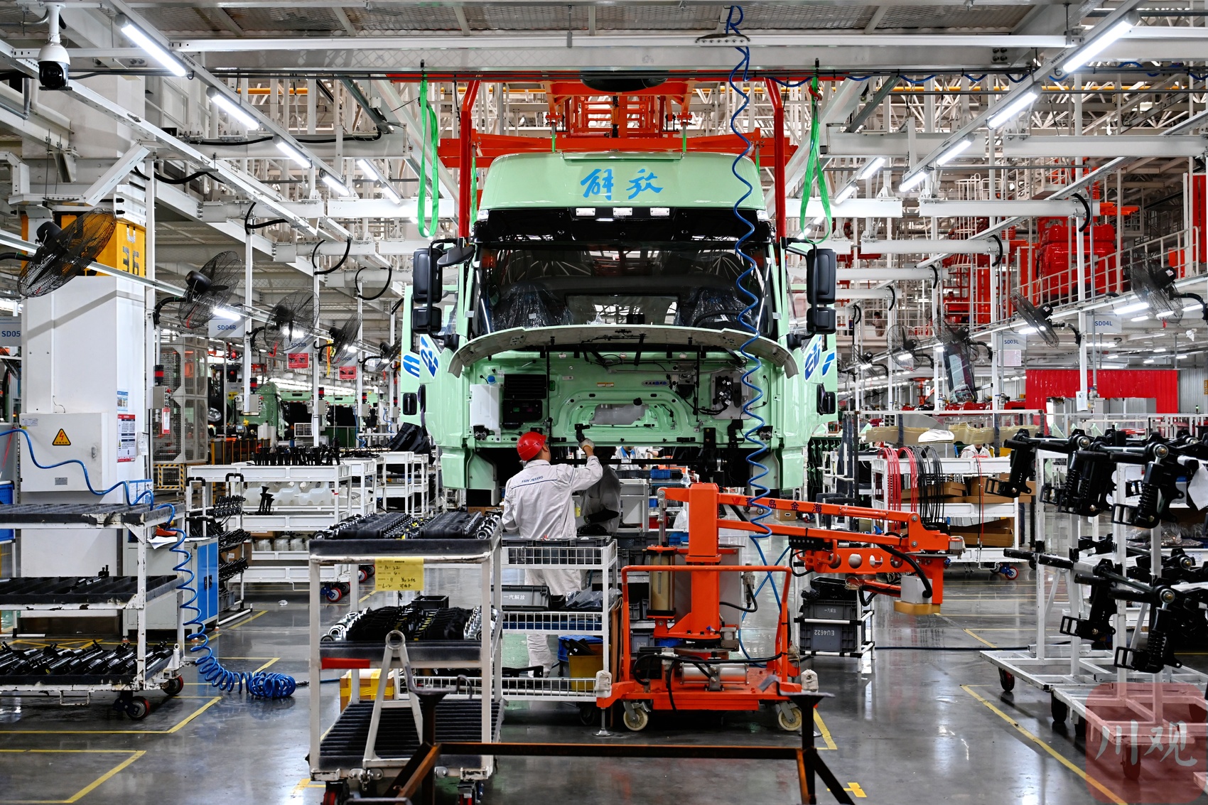 10分钟车程之外,一汽解放商用车广汉基地438米长的总装车间内,底盘、发动机、驾驶室等在地面上分别完成喷漆、分装、装配等工序,再通过空中廊道,缓缓“汇合”于整车装配线,平均5分48秒,就有一辆新能源商用车下线。
