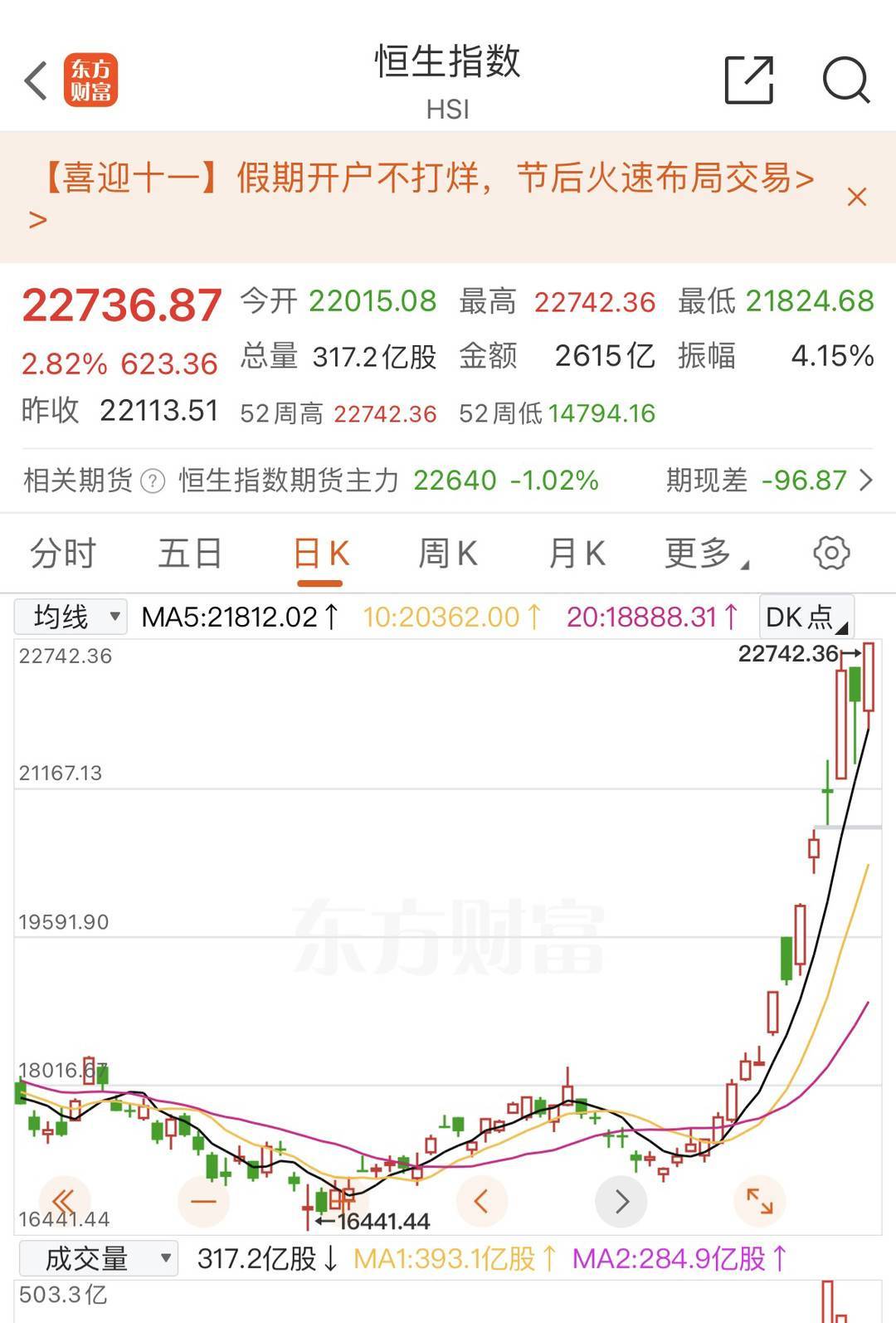 10月2日-10月4日,港股市场持续大涨,恒生指数涨幅达7.59%,恒生科技指数的涨幅达10%;美东时间周五(4日),美股三大股指集体收涨,道指涨0.81%,标普500指数涨0.9%,纳指涨1.22%。