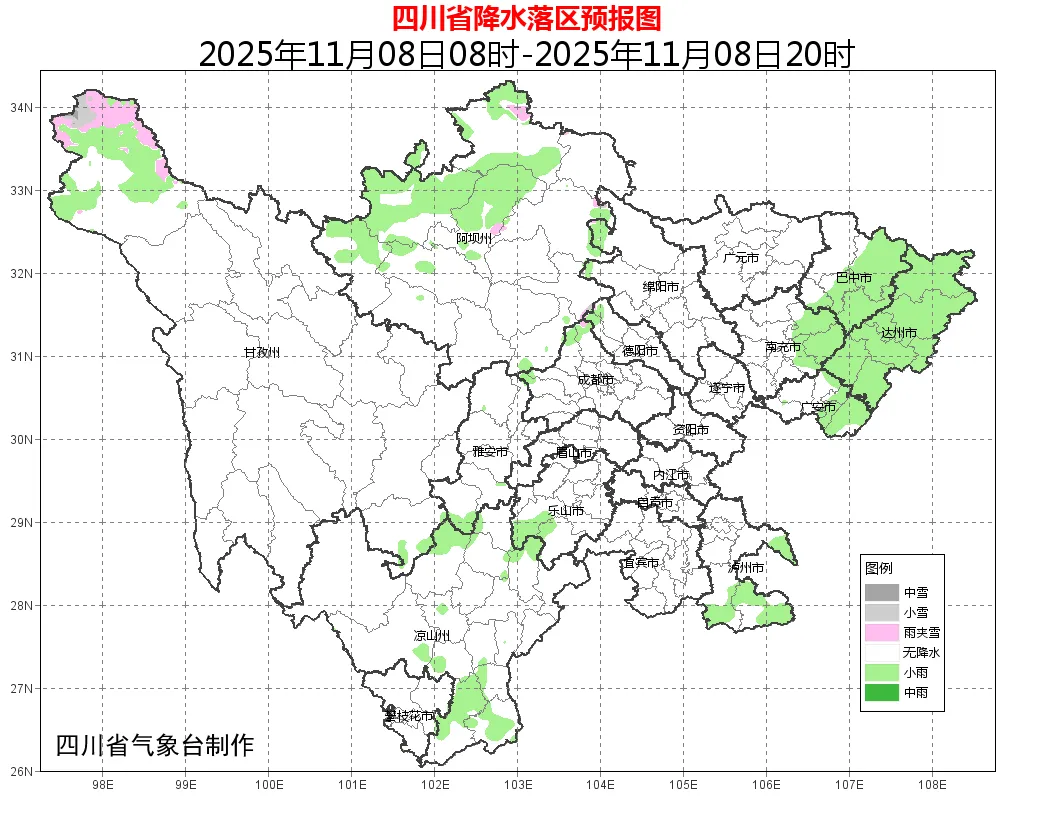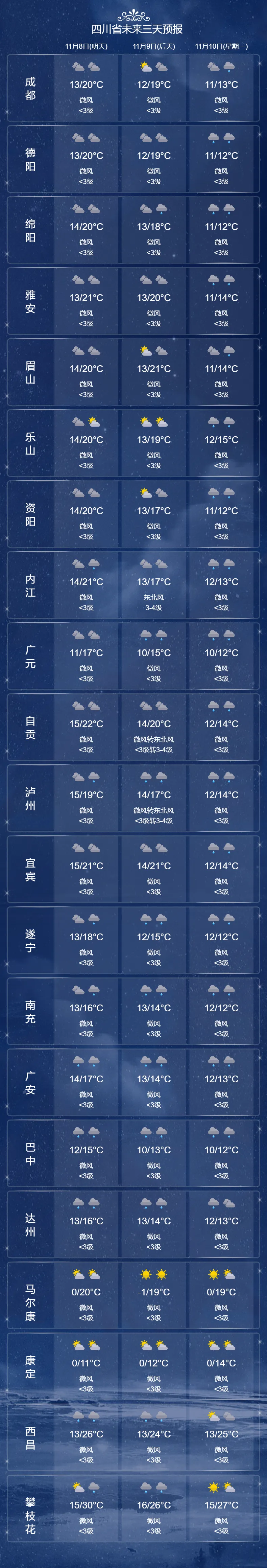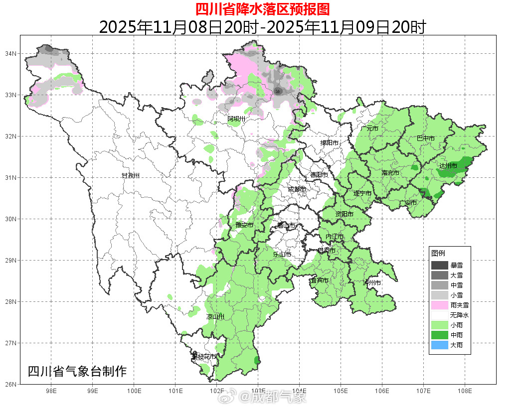 明天晚上到9日白天,盆地大部阴天有小雨或零星小雨,个别中雨;甘孜州西北部东部、阿坝州北部东部和凉山州大部多云间阴有分散阵雨(雪),川西高原和攀西地区其余地方晴间多云。