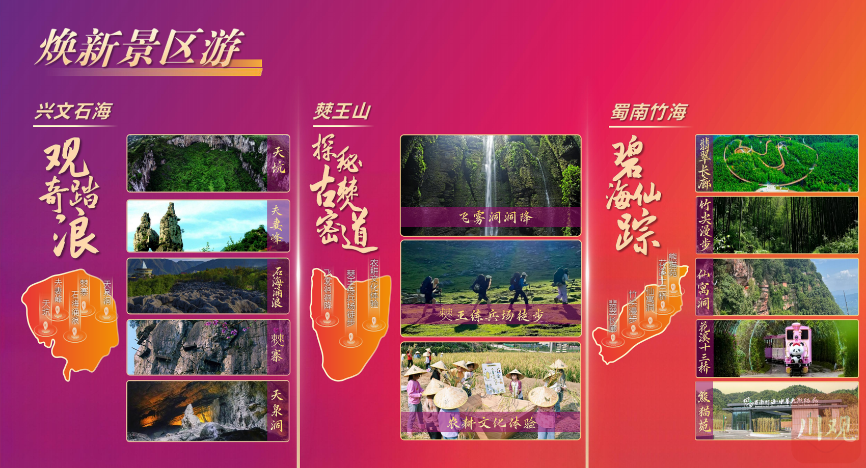 翻开线路图,“宜宾城区一日游”和“三江新区一日游”两条城市发展游线路,其中既有五粮液、李庄古镇、合江门等经典景点,也包括E-Park公园、龙头山三江之眼等新景点;另有“兴文石海”“僰王山”“蜀南竹海”三条焕新景区游览线路、串联七个县(区)的八条乡村振兴主题线路以及涵盖余泽鸿故居、朱德故居和李硕勋纪念馆的三条红色文化旅游线路。