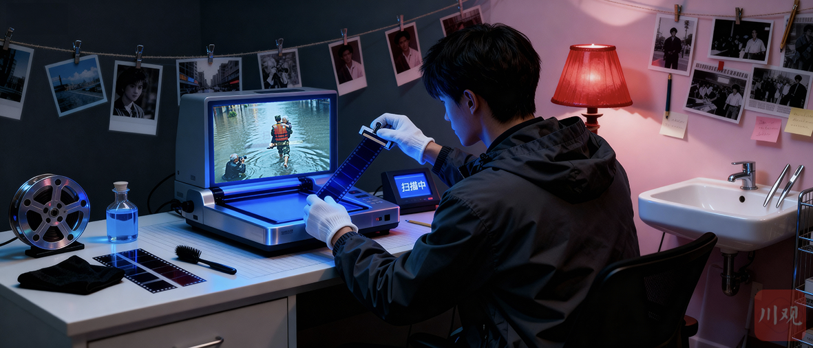 新闻摄影记者在暗房里扫描胶片,让新闻记忆在光影中焕新传承。