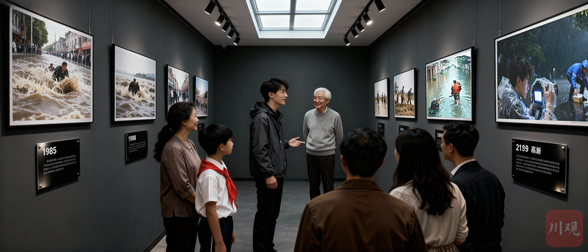 老中青三代在摄影展里,听新闻摄影记者讲述 “抗洪”“纪实” 照片背后的新闻故事,让新闻精神代代传承。
