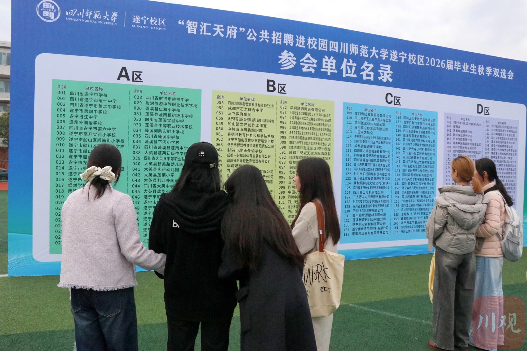 11月8日,“智汇天府”公共招聘进校园活动——四川师范大学遂宁校区2026届毕业生秋季双选会在四川师范大学遂宁校区举行。作为该校区启用后的首届毕业生双选会,活动吸引了200余家优质企事业单位参与,提供岗位近2000个,人才需求总量约5000人。