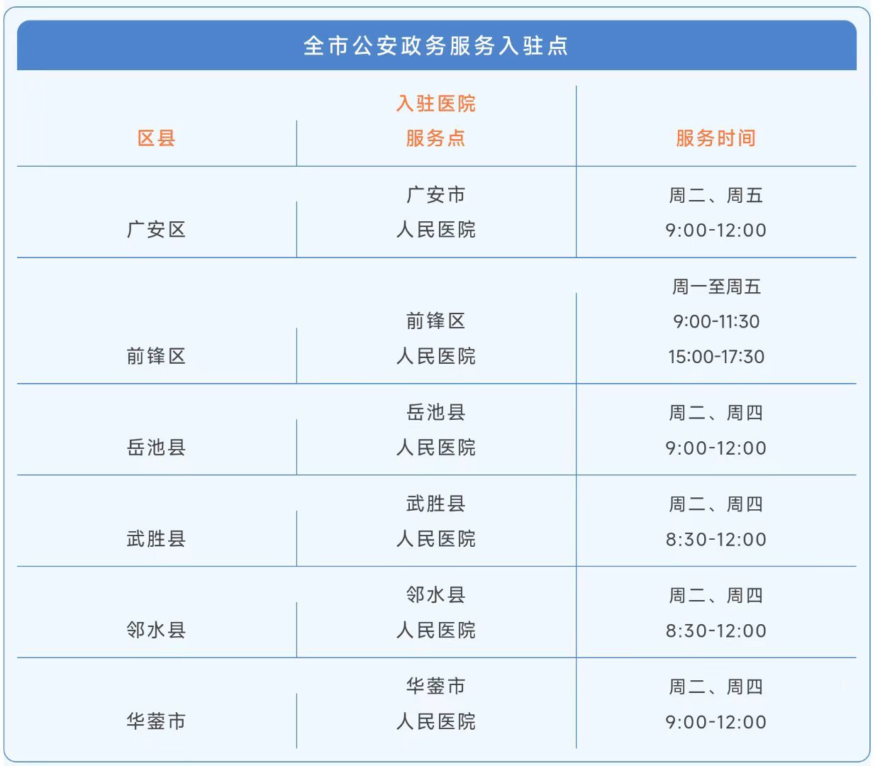 目前,该项政务服务已入驻广安市人民医院、前锋区人民医院、岳池县人民医院、武胜县人民医院、邻水县人民医院、华蓥市人民医院等6所医院。