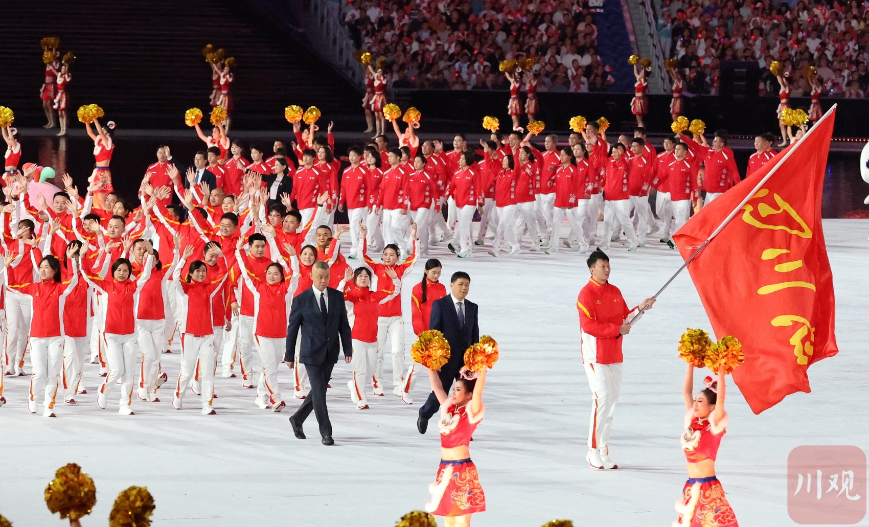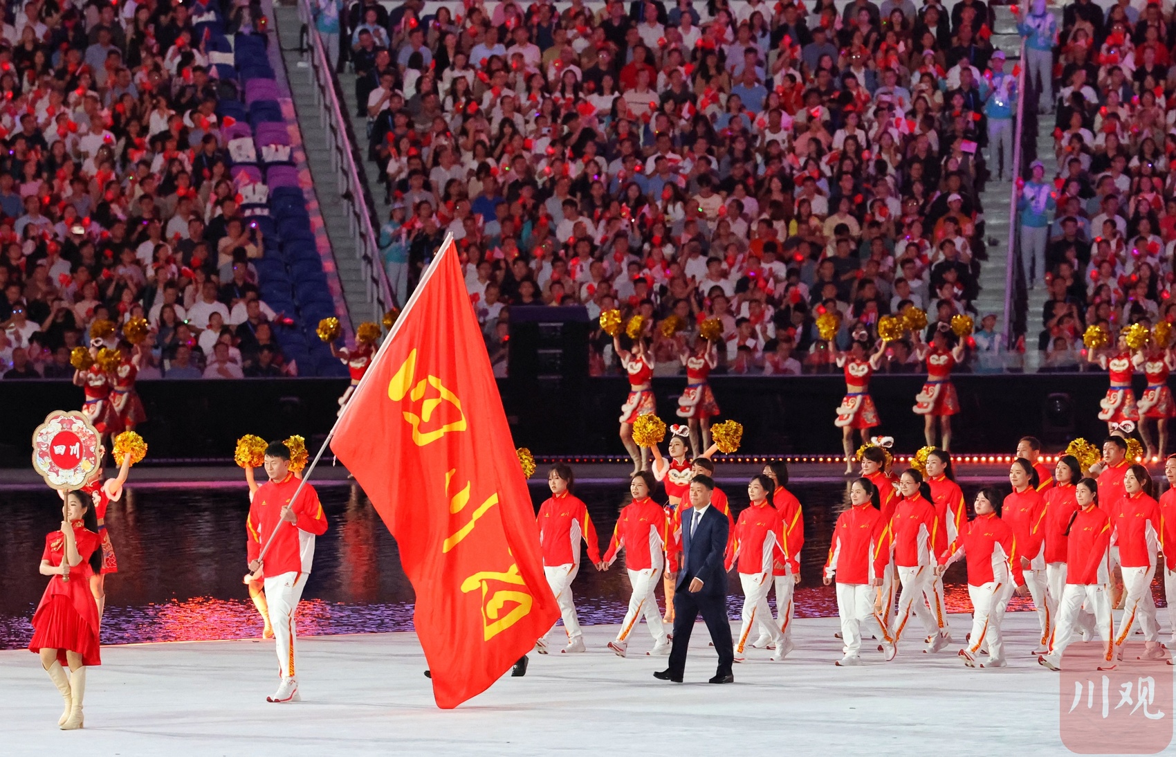 在现场播报员激昂的解说中,四川省体育代表团步入了第十五届全运会开幕式现场。走在队伍最前面的,是旗手左朕年。他挥舞着写着“四川省”的大旗,穿着四川省体育代表团在本届全运会的领奖服,昂首走来,朝气蓬勃地踏上第十五届全运会的征程。