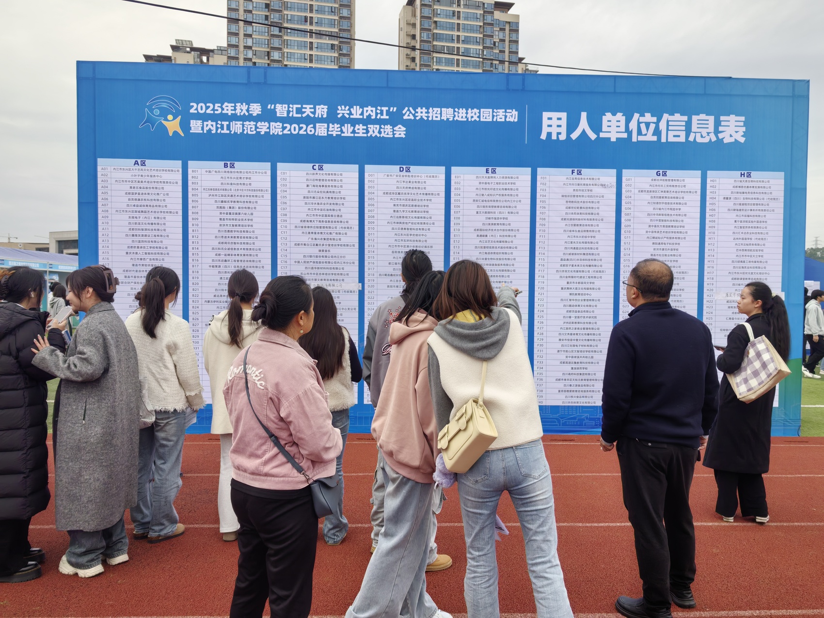 11月8日,“智汇天府 兴业内江”公共招聘进校园活动暨内江师范学院2026届毕业生双选会举行,300余家用人单位竞相进场揽才,提供涵盖教育、信息技术、现代服务等6000余个就业岗位,达成初步就业意向600余人。