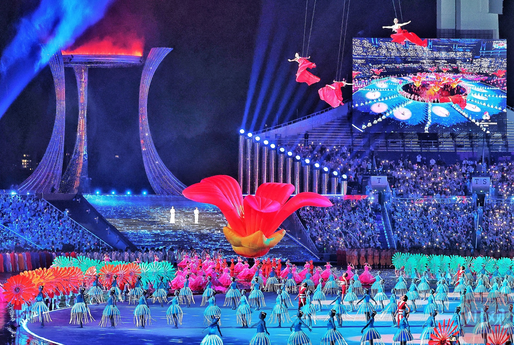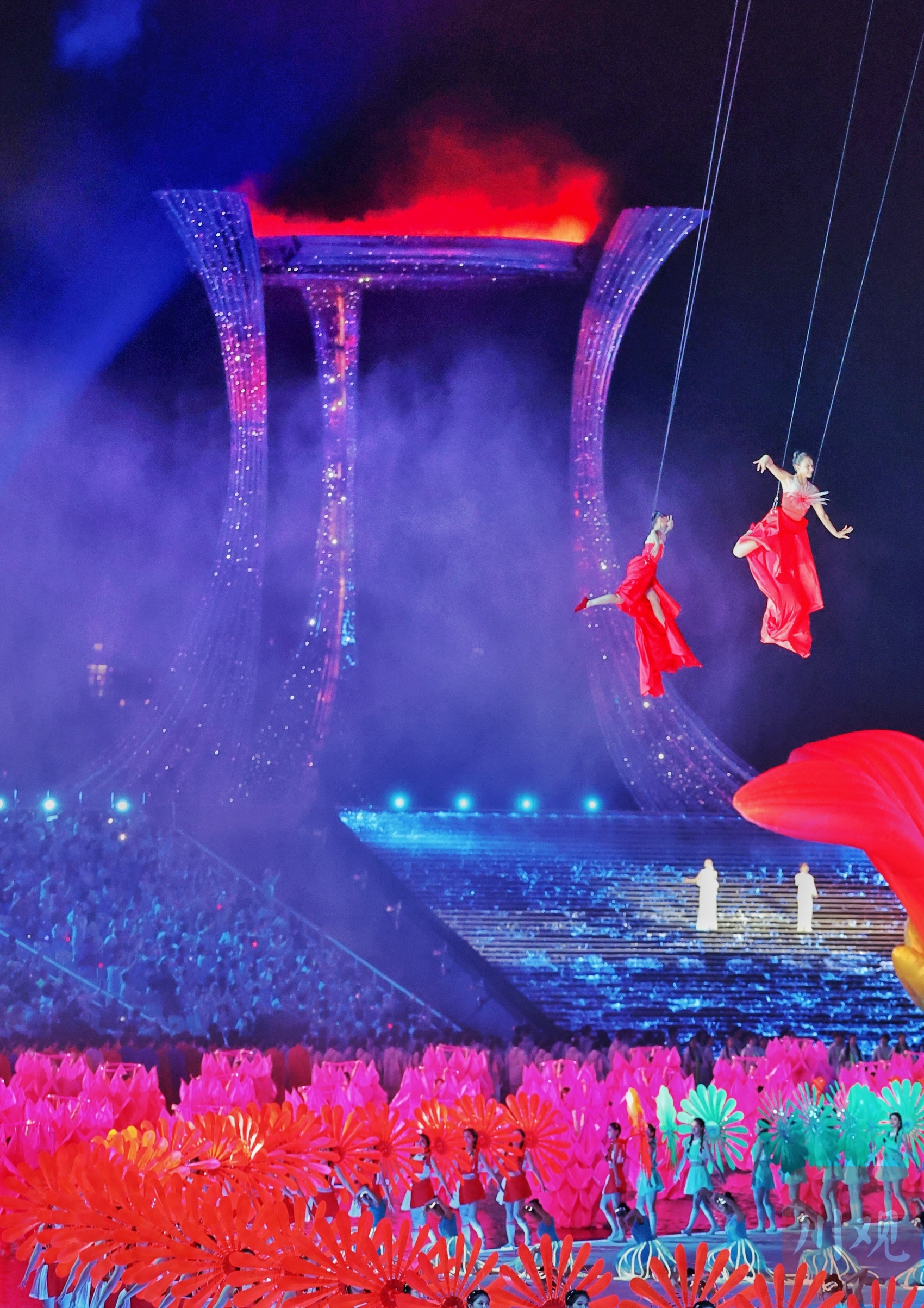 第十五届全国运动会开幕式上,火炬下的文艺展演。