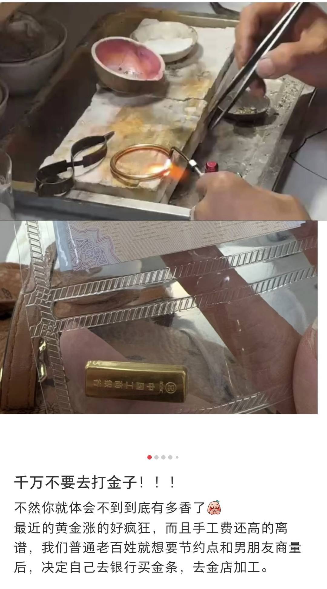 网友晒出在银行买金条、找私人打金饰的经历。图源社交平台