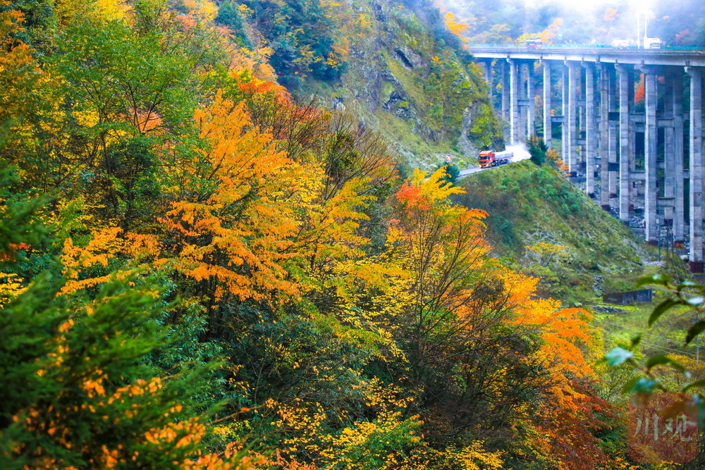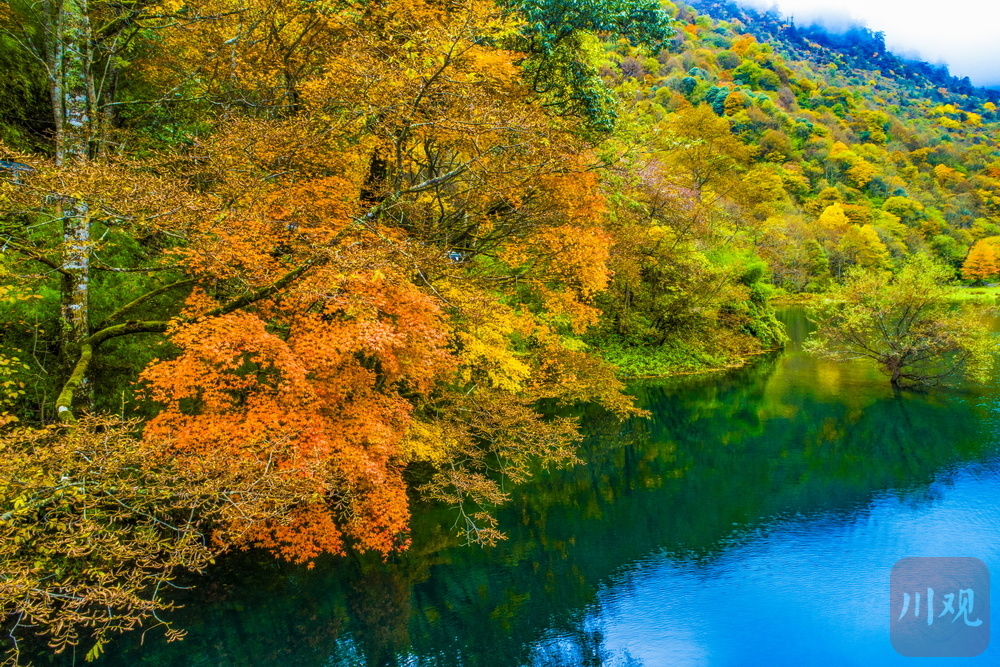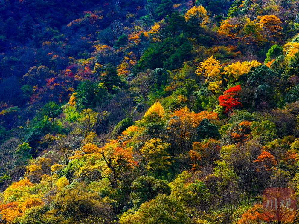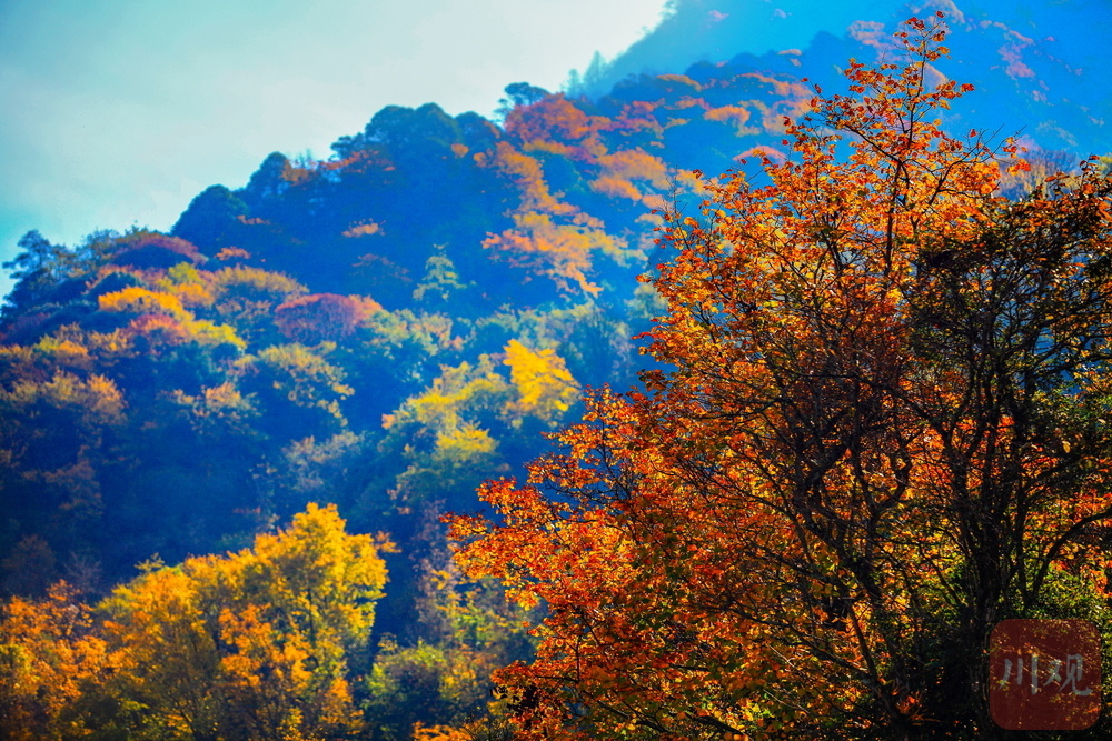 青山披彩画中游……眼下,雅安市石棉县栗子坪乡孟获城、月亮湖等地的彩林进入盛景期,起伏的群山层林尽染、溢彩流金,与碧水蓝天一起勾勒出一幅宜人的美丽画卷。