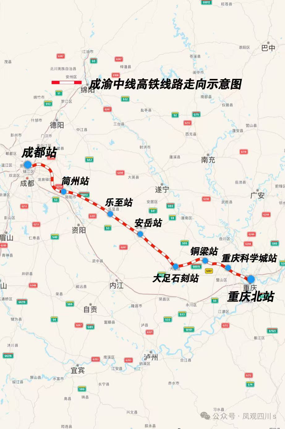成渝中线高铁是我国“八纵八横”高铁网沿江通道的重要组成部分。线路自重庆枢纽重庆北站起,向西经重庆市渝北区、沙坪坝区、璧山区、铜梁区、大足区,四川省资阳市、成都市,引入成都枢纽成都站,正线全长292公里,预计2027年底建成通车。