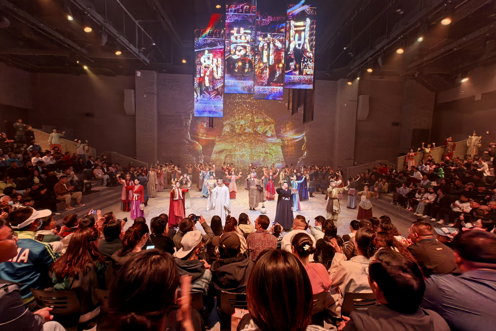 行进情浸式演艺《如梦大同》通过全息投影、数控LED屏等现代科技,融合云冈石窟、华严寺等元素,打造出身临其境的观演体验。