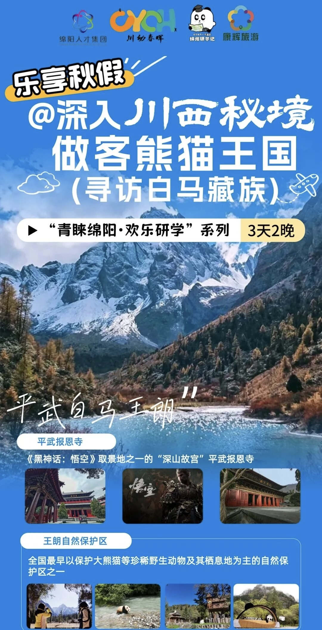 “深入川西秘境、做客熊猫王国,在白马王朗原始森林自然探秘研学珍稀生灵的家园。”绵阳春晖教育公司相关负责人介绍,家长和学生可以一同走进白马藏乡,触摸非遗魅力,探秘生物多样性。