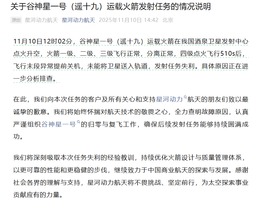 星河动力航天也发布了情况说明:11月10日12时02分,谷神星一号(遥十九)运载火箭在我国酒泉卫星发射中心点火升空,火箭一级、二级、三级飞行正常,分离正常,四级点火飞行510s后,飞行末段异常提前关机,未能将卫星送入轨道,发射任务失利。具体原因正在进一步分析排查。