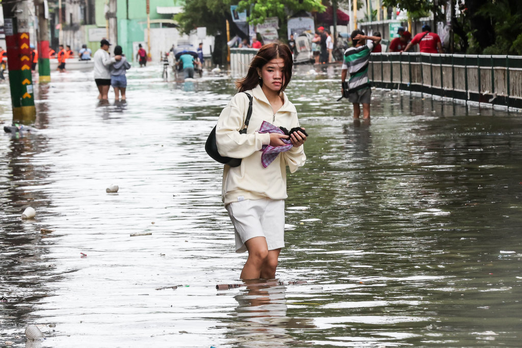 11月10日,在菲律宾纳沃塔斯市,一名女子涉水行走。