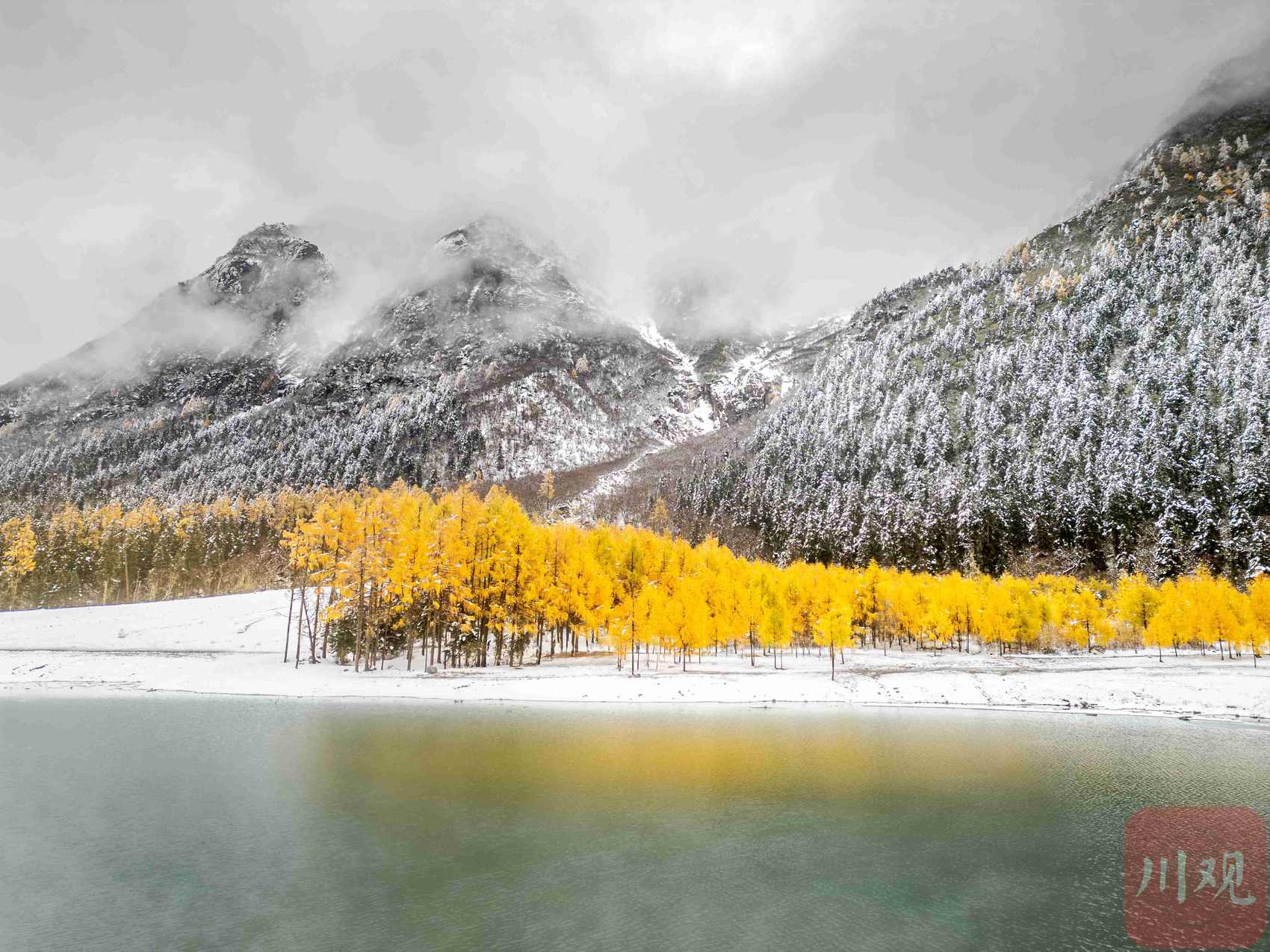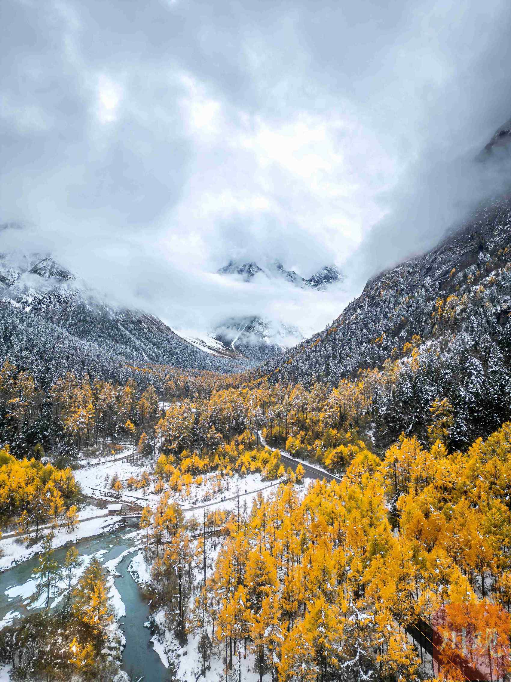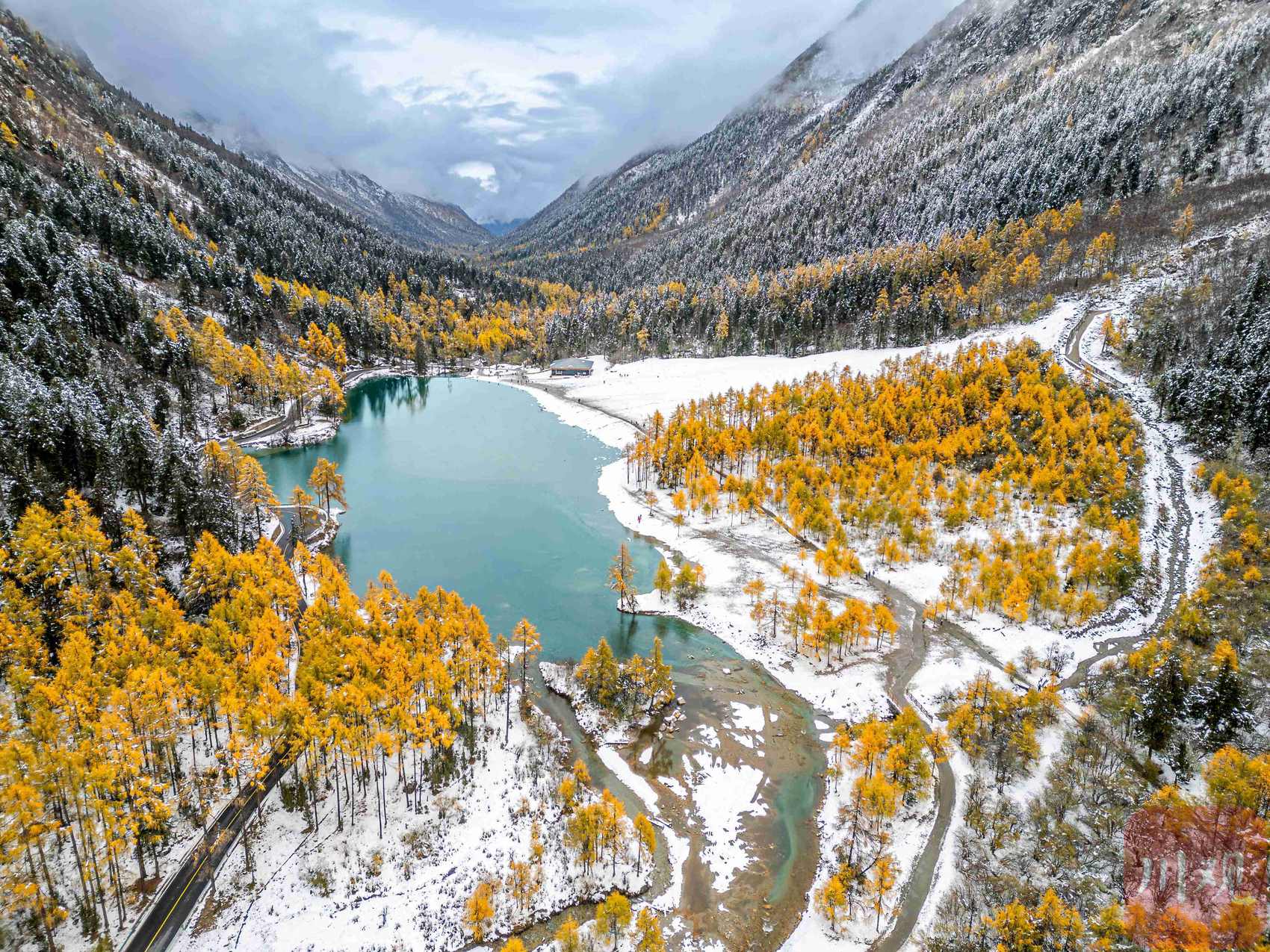 雪覆彩林、碧水映雪山,金黄与雪白交织成深秋童话秘境。
