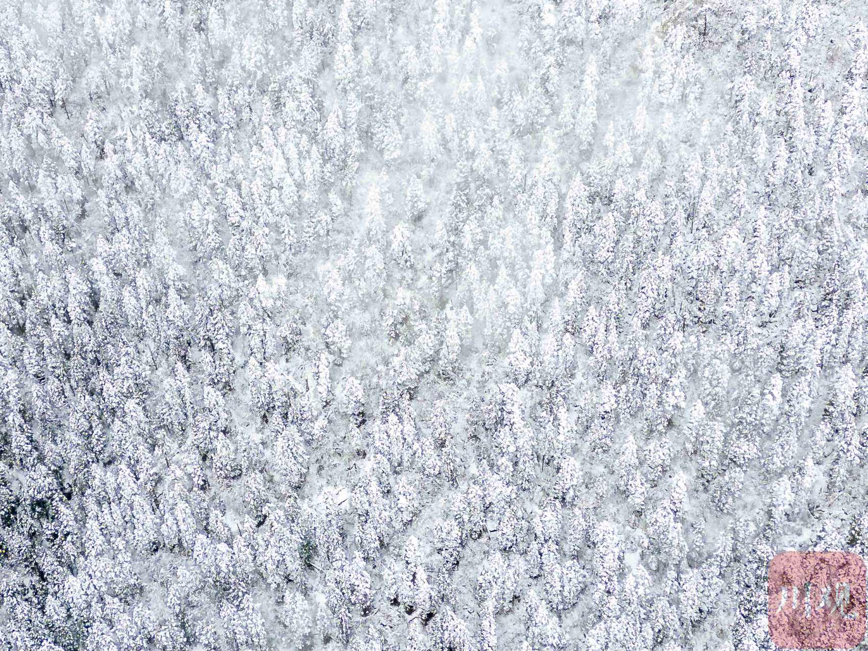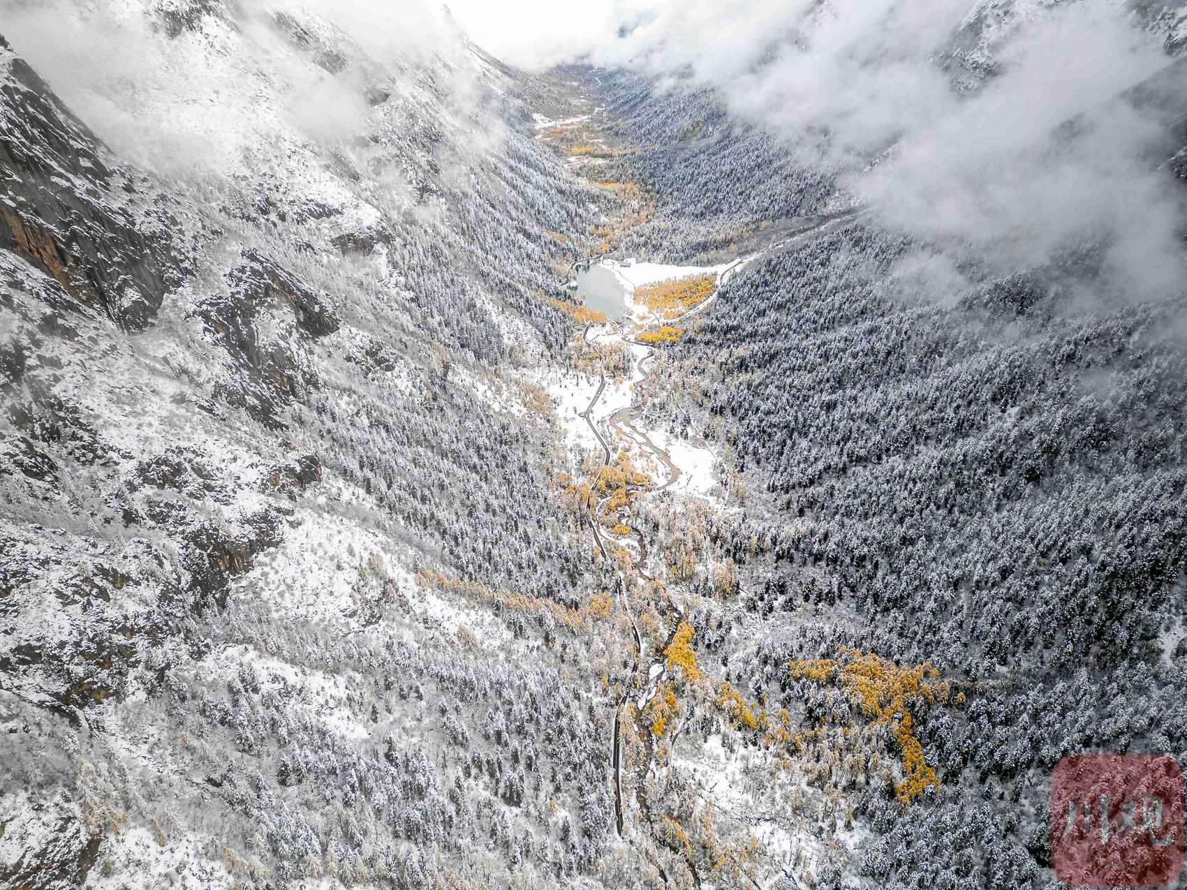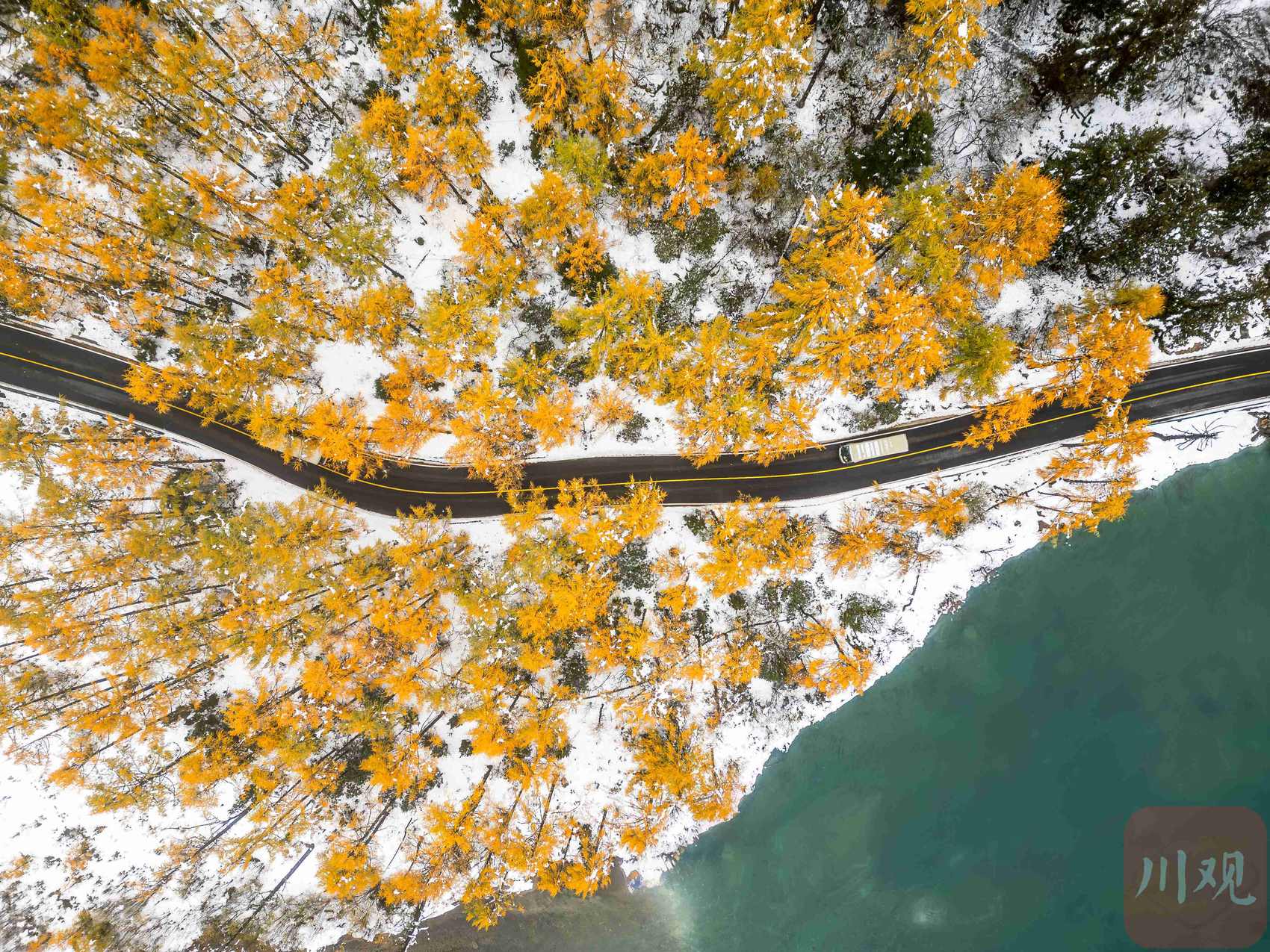 雪覆彩林、碧水映雪山,金黄与雪白交织成深秋童话秘境。