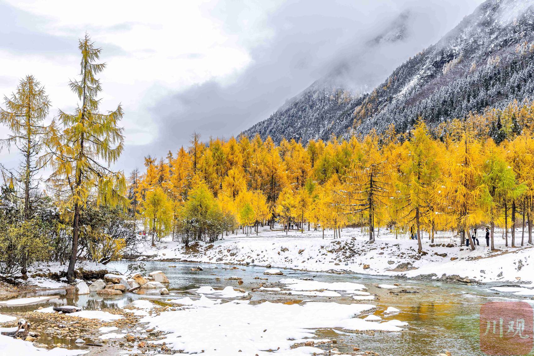 毕棚沟景区迎来深秋降雪,白雪与彩林、碧水相映成趣,引得游客来