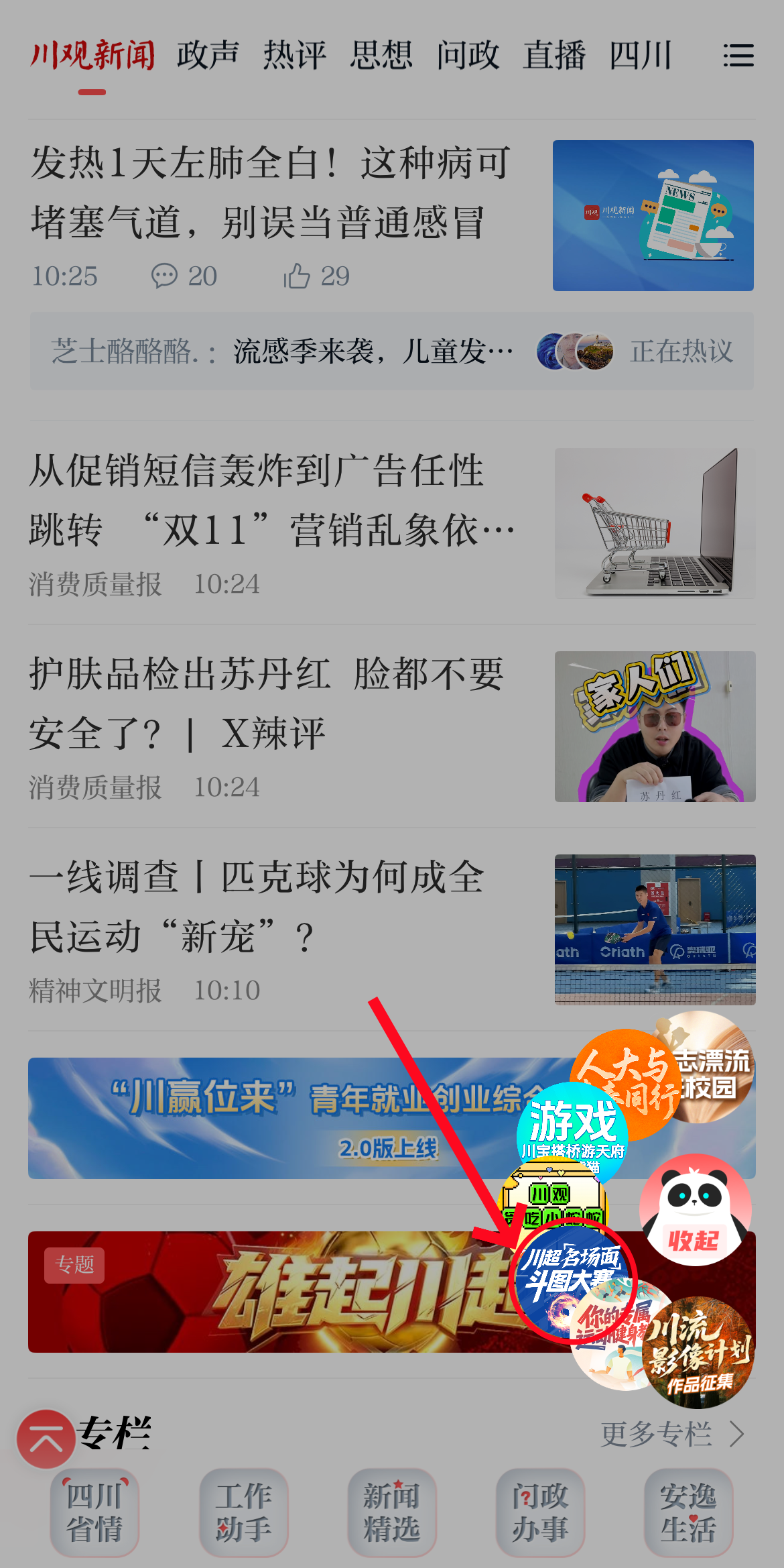 入口一:打开川观新闻App,首页右下角悬浮球选择“斗图大赛”按钮,点击进入活动。