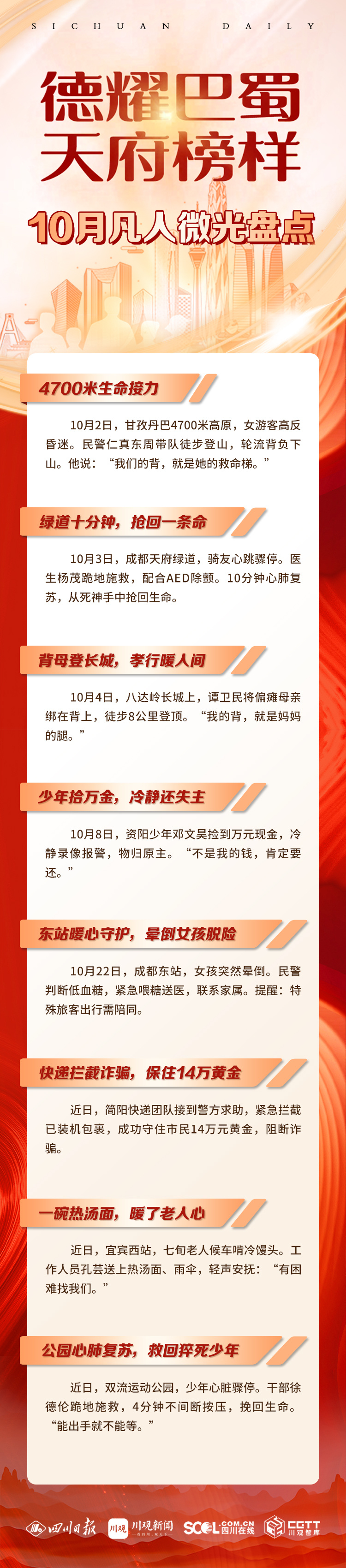 “德耀巴蜀天府榜样”定格10月凡人微光。他们中有背母登长城的孝子、绿道救急的医护人员、车站助老的工作者,也有跨城拦诈的快递团队、拾金不昧的少年学子。或于危急时冲锋,或于日常中暖心,以平凡之躯写就不凡感动。让我们重温这些暖到心底的瞬间,接住平凡英雄传递的滚烫力量。