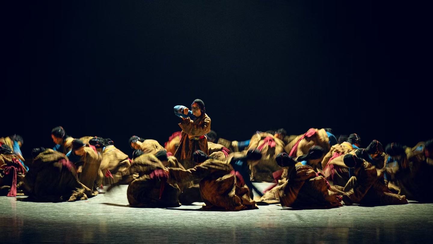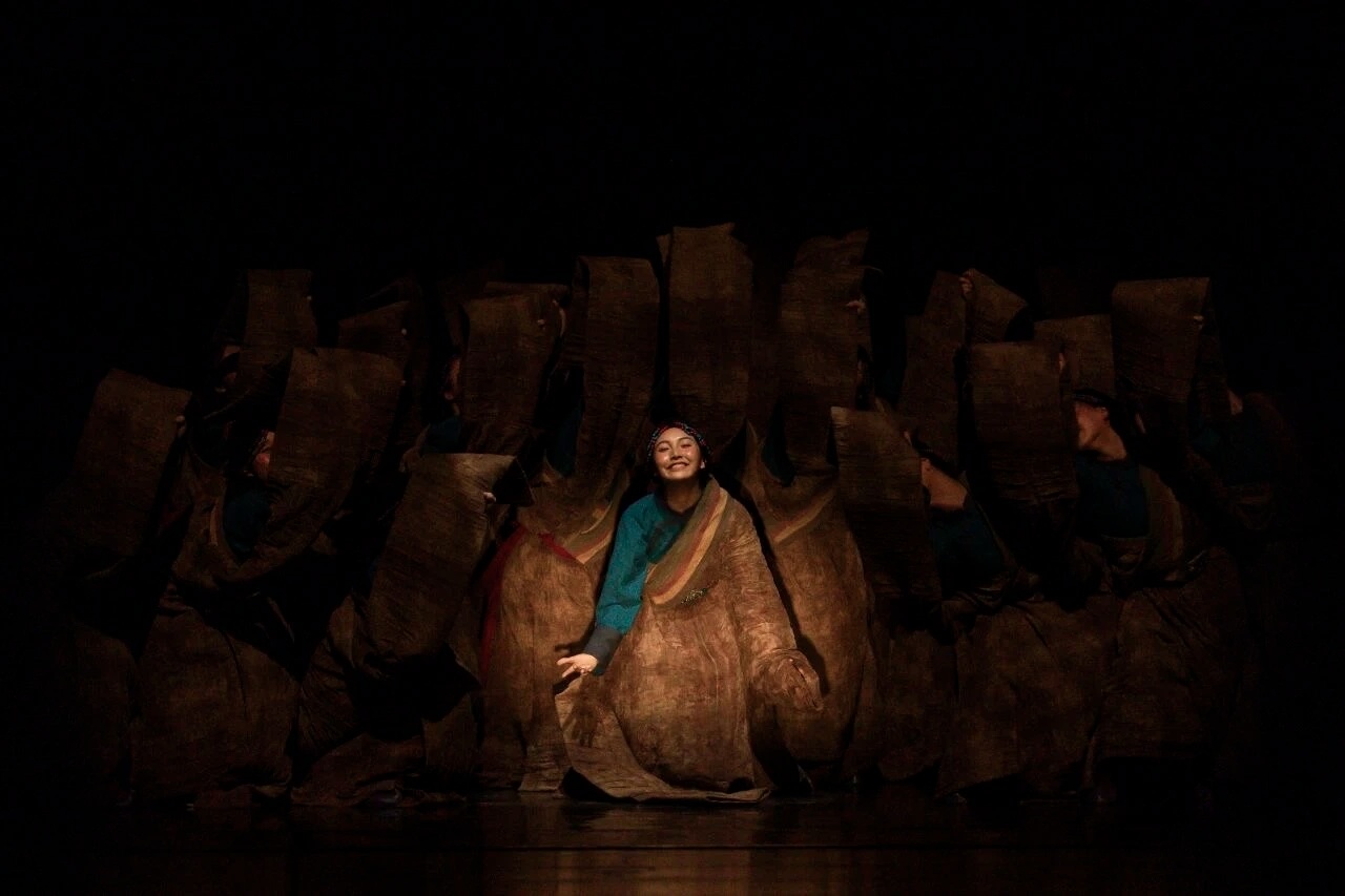 尤其令人动容的是,舞者将袖子搭肩的动作,既保留了藏族女性的温婉仪态,又暗含汉族文化中先生的庄重气质,在跨文化符号的融合中塑造出智慧、柔韧而有力的女性群像。舞台视觉设计同样充满哲思。灯光以暖色调为主,通过明暗变化,使舞台宛如一幅流动的油画。后半段舞者“见尘埃、见光、见所画之物”时的情感迸发,与前半段的静谧形成强烈对比,暗喻着文化传承中“守静”与“破茧”的辩证统一。