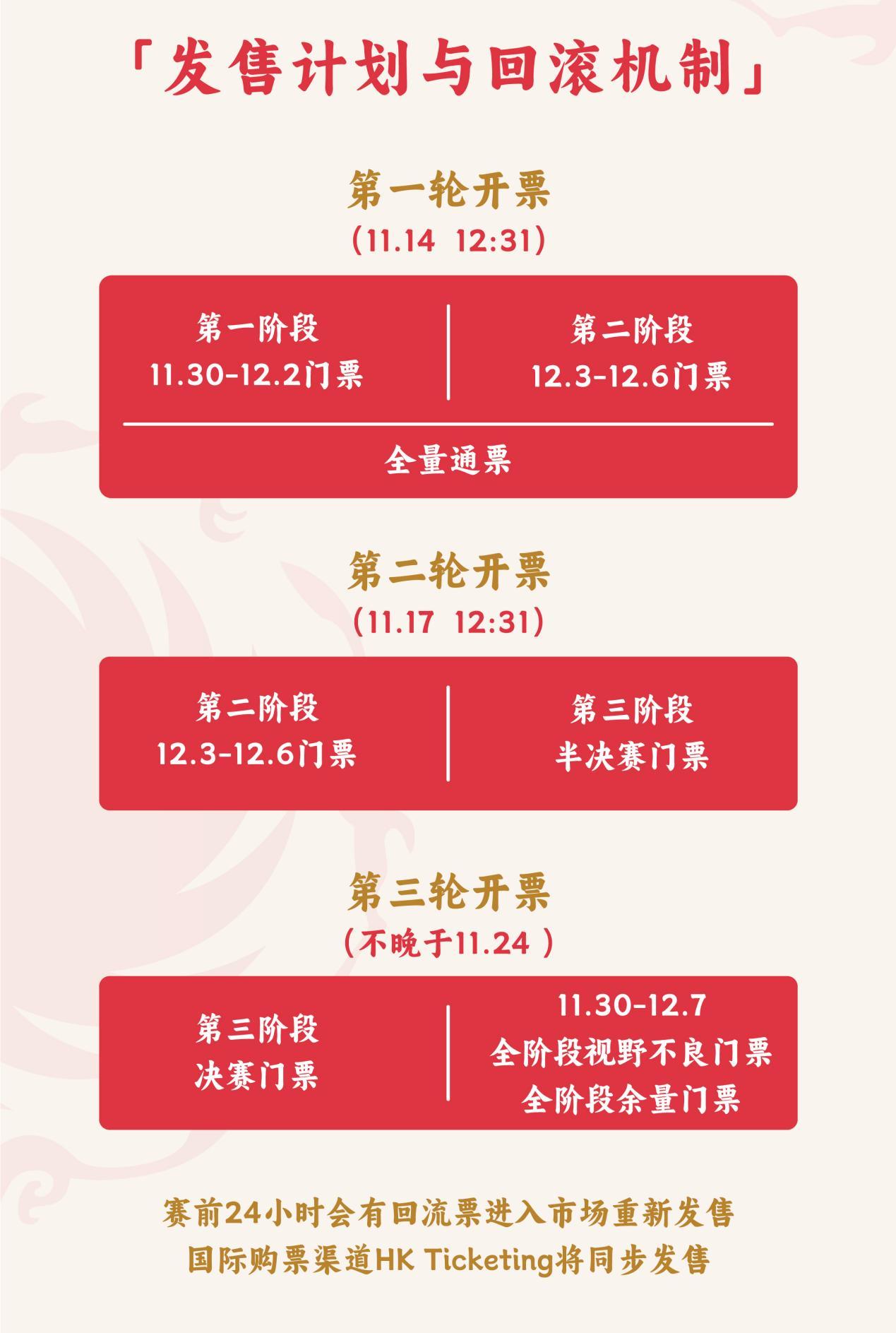 第二轮次门票将于11月17日开售,计划释放剩余循环赛门票以及60%半决赛场次门票。