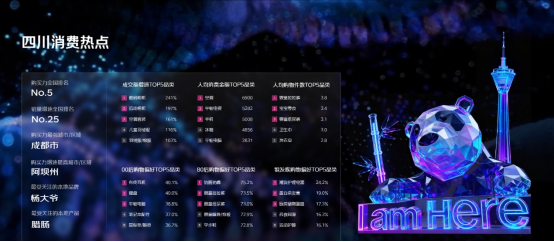 每一个年龄段的消费人群,都有属于自己的消费偏好:四川的00后对3C数码类产品更为关注,有线耳机、键盘、平板电脑、笔记本配件、鼠标垫和腕垫是这群年轻人购物偏好TOP5品类,购物用户数占比分别为40.1%、40.0%、38.8%、37.0%、36.7%;80后大多为宝宝消费,奶瓶奶嘴、婴童拉拉裤、婴童纸尿裤、婴童睡袋和抱被、学步鞋是80后购物偏好TOP5品类,购物用户数占比全部高于70%;银发族消费注重生活品质,同时不忘健康、形象两手抓,潮流护理电器(含颈椎按摩仪、足部按摩仪等)、盖白染发膏、厨房储物器皿、药食同源、运动护膝是银发族购物偏好TOP5品类。
