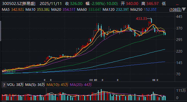 然而,就在新易盛发布靓丽的三季报后,公司股价却迎来快速回调,于近日击穿60日均线后继续走弱,于11月10日最低探至322.75元,区间市值最大蒸发达1099.13亿元。