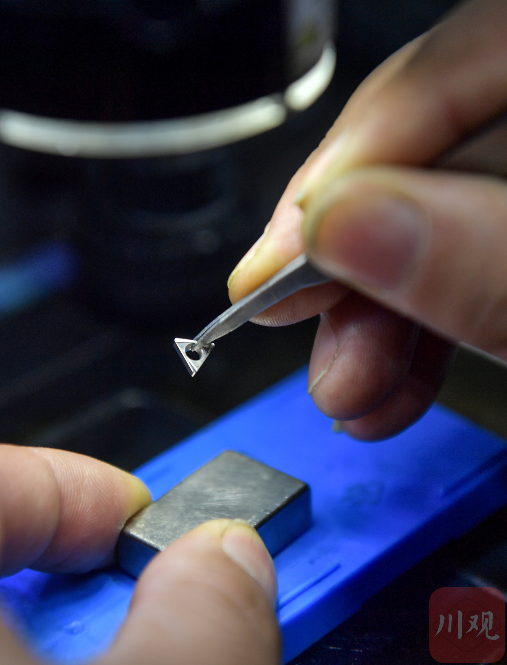记者在采访中获悉,该公司研发的最精微刀片,其刀刃宽度仅0.02毫米,约为一根头发丝直径的四分之一,专为高精密数控车床量身打造,用于精密切削复杂零部件,为高端装备制造提供关键技术支撑。与此同时,企业生产的最大单件产品重量接近30公斤,可适配大型机械加工与重型装备制造等场景,实现了“小而精”与“大而强”的全面覆盖,彰显出“成都制造”的雄厚实力。