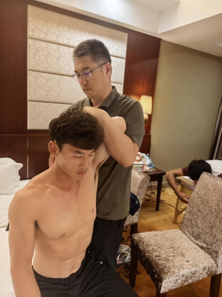 四川省骨科医院沈海教授赛前在应用中医运动医学理念和方法为谷建滔评估治疗,同时提出预防伤病的建议。